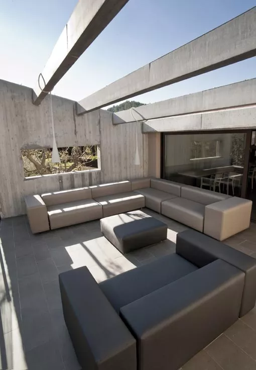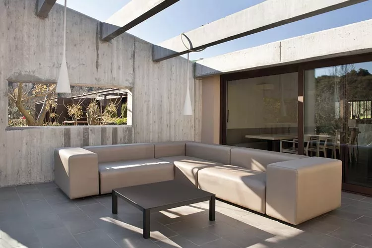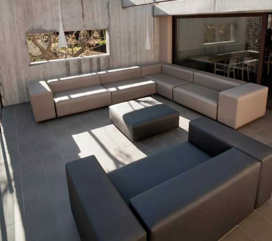 A modular sofa with interior PE core material upholstered with removable waterproof or acrylic fabric. Combination of comfortable foams, connected by a polyvalent structure of powder coating steel.