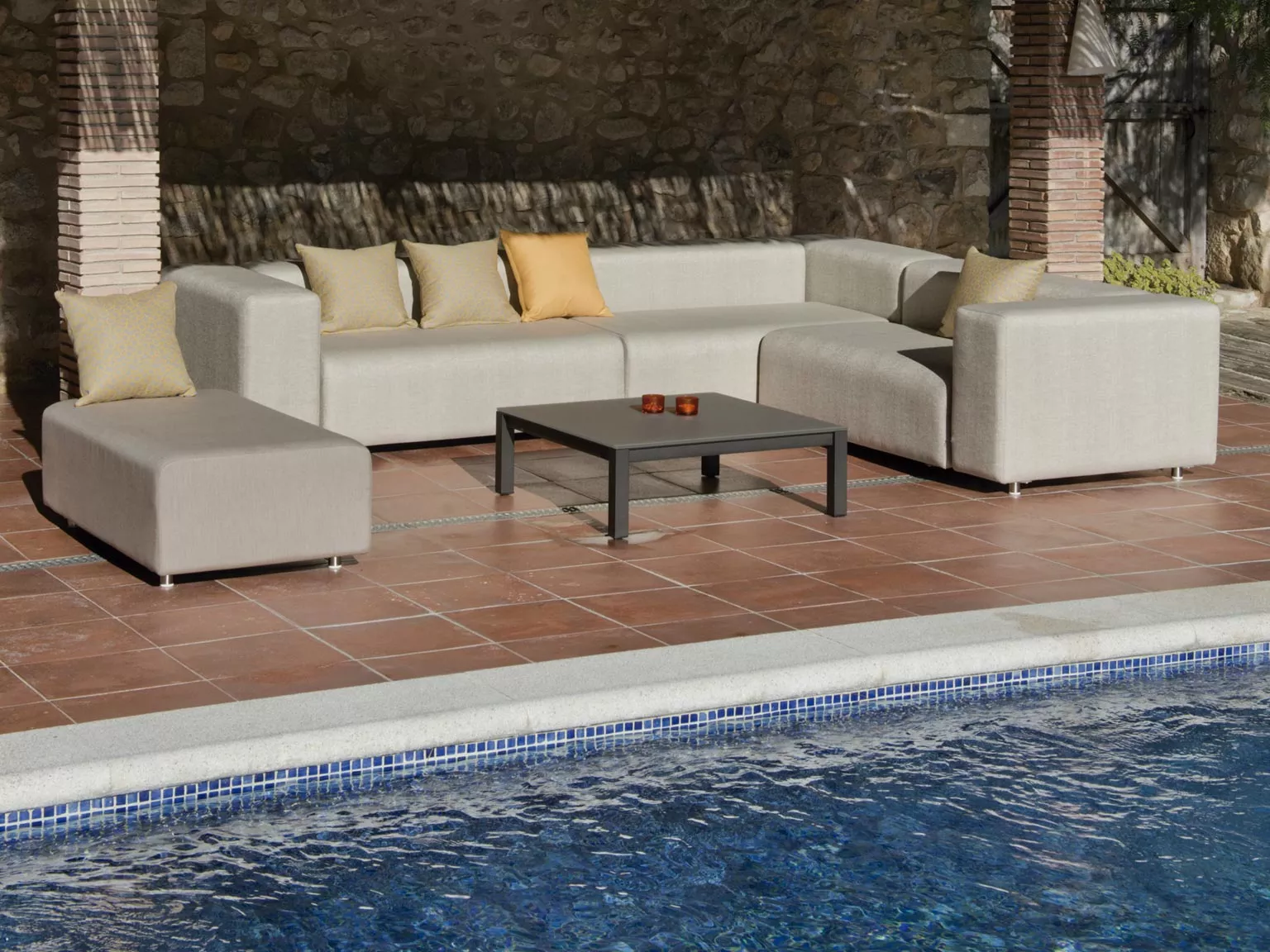 A modular sofa with interior PE core material upholstered with removable waterproof or acrylic fabric. Combination of comfortable foams, connected by a polyvalent structure of powder coating steel.