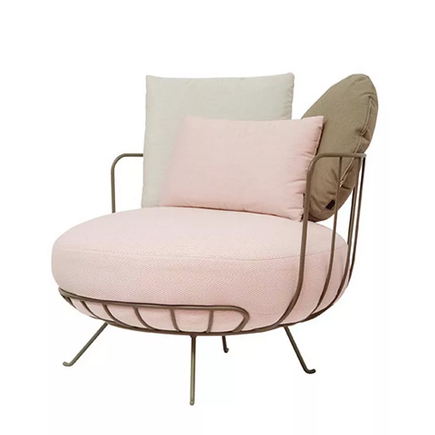 Das Gestell besteht aus massivem Stahldraht, verzinkt und pulverbeschichtet lackiert. Die Sitzkissen bestehen aus eine Kombination aus Komfortschäumen mit wasserdichtem Innenbezug aus technischem Gewebe und heißversiegelten Nähten und einer Außenmantelkonfektion mit Sunbrella LOPI-Acrylgewebe in verschiedenen Farben. Die Kollektion wird mit zusätzlichen Dekokissen komplettiert.