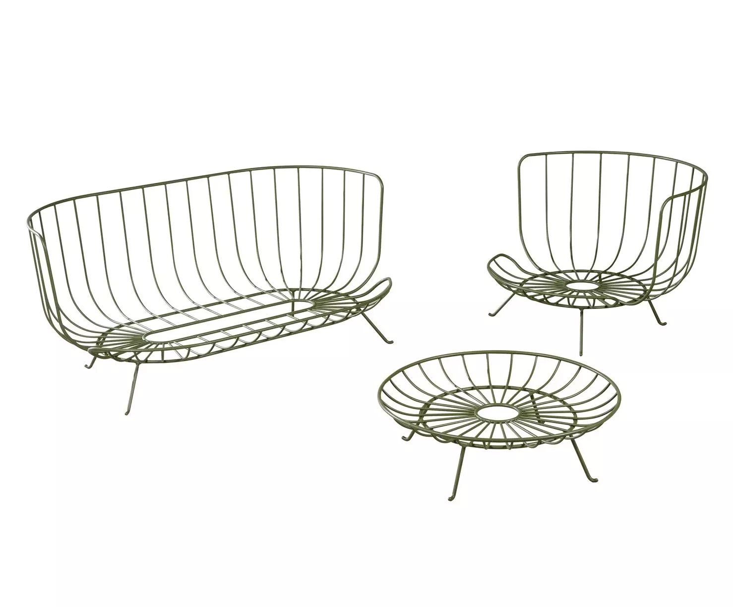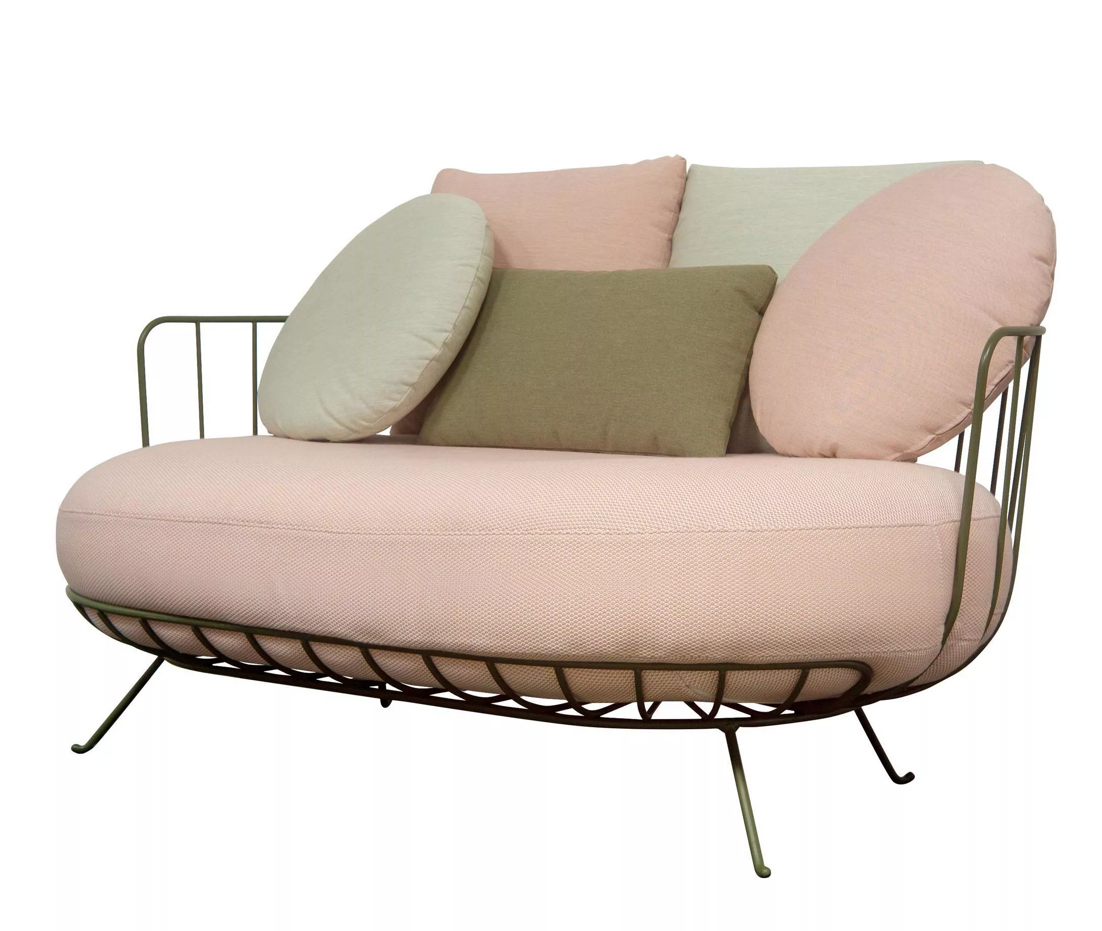 Das Gestell besteht aus massivem Stahldraht, verzinkt und pulverbeschichtet lackiert. Die Sitzkissen bestehen aus eine Kombination aus Komfortschäumen mit wasserdichtem Innenbezug aus technischem Gewebe und heißversiegelten Nähten und einer Außenmantelkonfektion mit Sunbrella LOPI-Acrylgewebe in verschiedenen Farben. Die Kollektion wird mit zusätzlichen Dekokissen komplettiert.