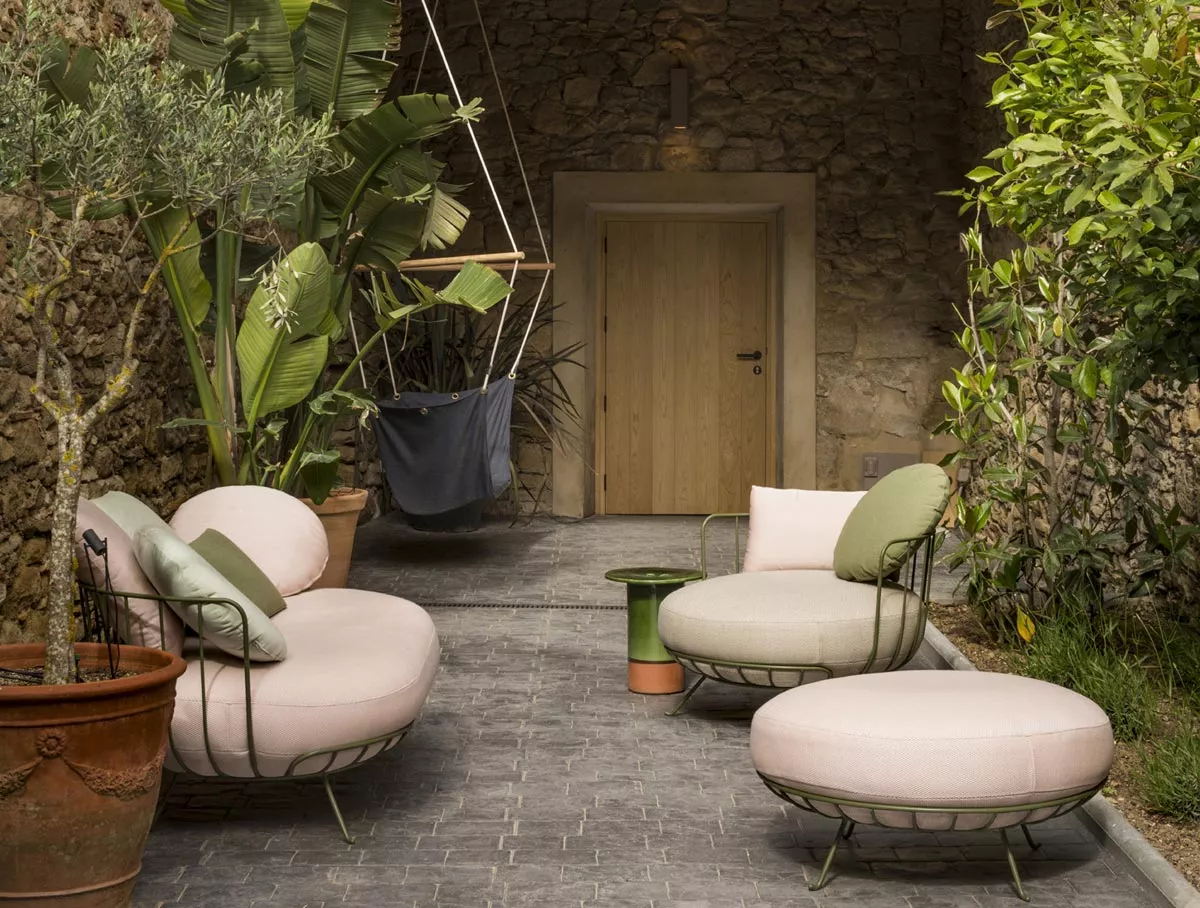 Lou ist das Ergebnis der ersten Zusammenarbeit zwischen dem Studio von Inma Bermúdez und Calma. Die Kollektion besteht aus drei Teilen: einem Hocker, einem Loungesofa und einem Sofa. Sie werden gerne „weiche“ Möbel genannt. Das Sitzkissen besteht aus verschiedenen Viskoelastik-Schichten und ist dadurch besonders bequem. In den Wintermonaten abgenommen, behält Lou durch sein zart leichtes Drahtgestell immer noch ein skulpturales Aussehen.