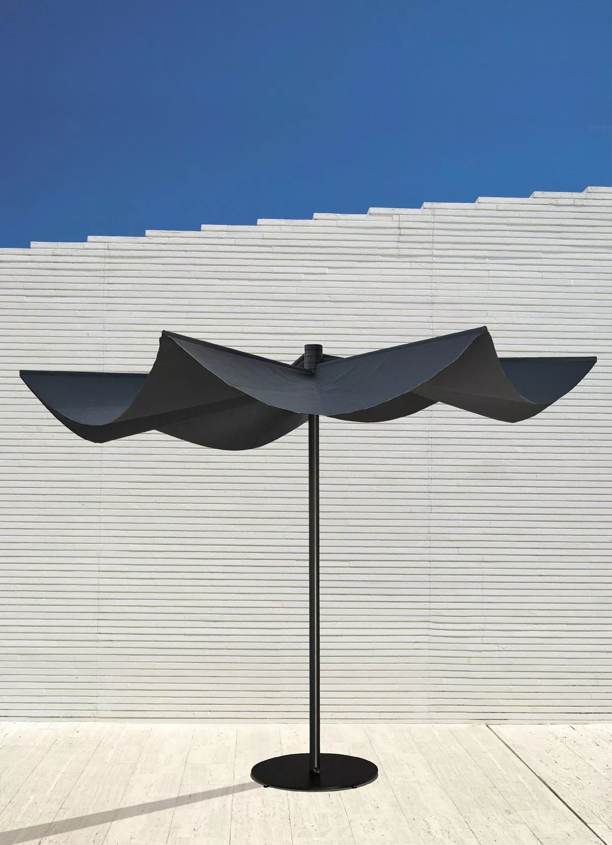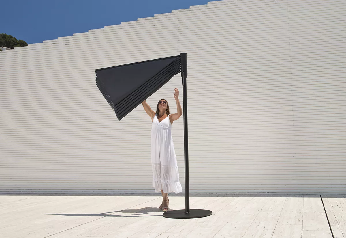 Calma "OM" Mittelstockschirm Ø 300 cm Der OM-Sonnenschirm ist das Beste vom Besten. Nicht weil wir es sagen, sondern weil es die anerkannte Jury des renommierten Preises RED DOT 2015 sagt. Der OM-Sonnenschirm wurde mit dem renommierten internationalen Produkt-Design-Preis RED DOT "Best of the Best" ausgezeichnet, dank seiner Qualität und seines innovativen Designs. "Der OM-Sonnenschirm vereint ein klares und elegantes Design mit äußerst raffinierter Funktionalität. Das innovative, herausragend clevere Rotationssystem ist äußerst faszinierend, da es ein komfortables Öffnen und Schließen ermöglicht. Der Sonnenschirm kann in vielen verschiedenen Konfigurationen verwendet werden und verbessert nahezu jede Atmosphäre. Er kann als frei stehender Schirm oder an der Wand befestigt sowie als Raumteiler verwendet werden. Darüber hinaus verleiht ihm der Einsatz hochwertiger Materialien eine hohe Langlebigkeit." Dies sind die genauen Worte der Red-Dot-Jury, bestehend aus 38 international renommierten Experten aus 25 verschiedenen Ländern. Eloxierter und dekorativer Strangpress-Aluminiummast und -stangen aus Aluminium 6063, in Schwarz oder Silber. Solide mechanisierte Aluminiumringe aus 6063 mit Kunststoffkappen und Unterlegscheiben in allen Strukturen. Öffnungssystem aus rostfreiem Stahl 304. Abdeckung aus Polyester-Sonnenschutzgewebe Sunless 500. Abmessung Durchmesser: 300 cm Höhe: 232 cm Stoff: Sunless 500, PVC-beschichtetes, sehr reißfestes Polyester-Gewebe
