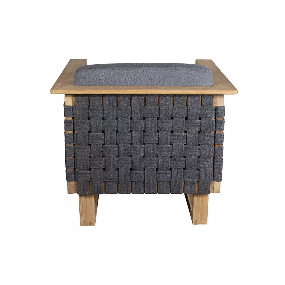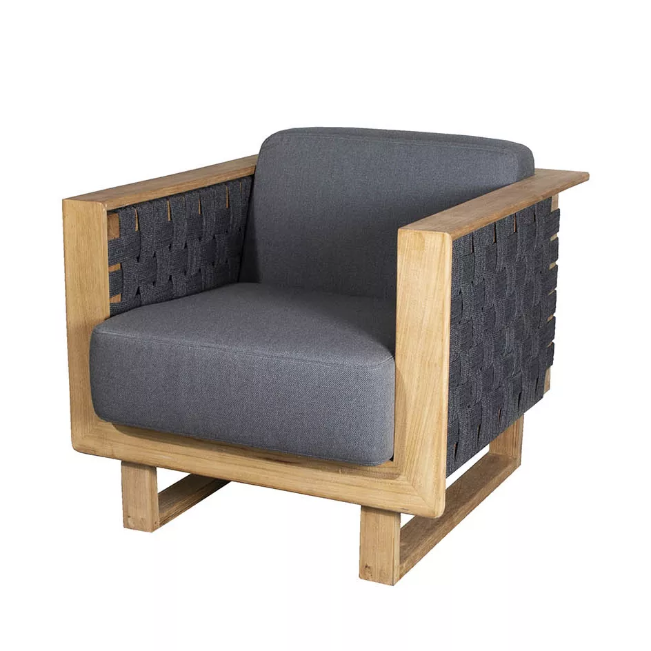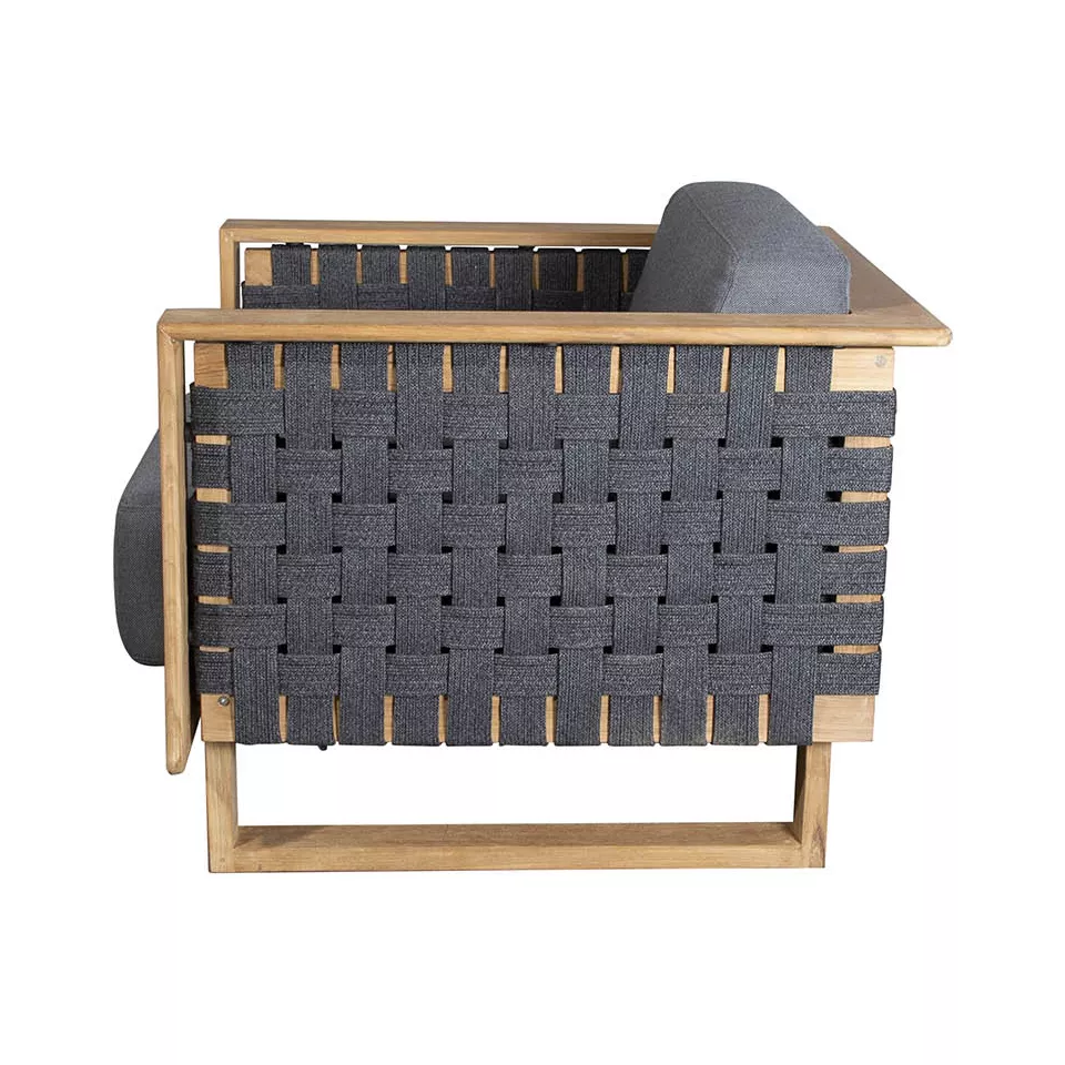 Der Loungesessel Angle, entworfen von den dänischen Designern Foersom & Hiort-Lorenzen MDD, bietet hervorragenden Komfort und exquisite Handwerkskunst. Der markante Rahmen besteht aus hochwertigem Teakholz, die Seiten sind mit einem handgeflochtenen Muster aus weichem Cane-line Soft Rope in Dunkelgrau verziert. Diese Kombination verleiht dem Sessel ein exklusives und elegantes Aussehen.