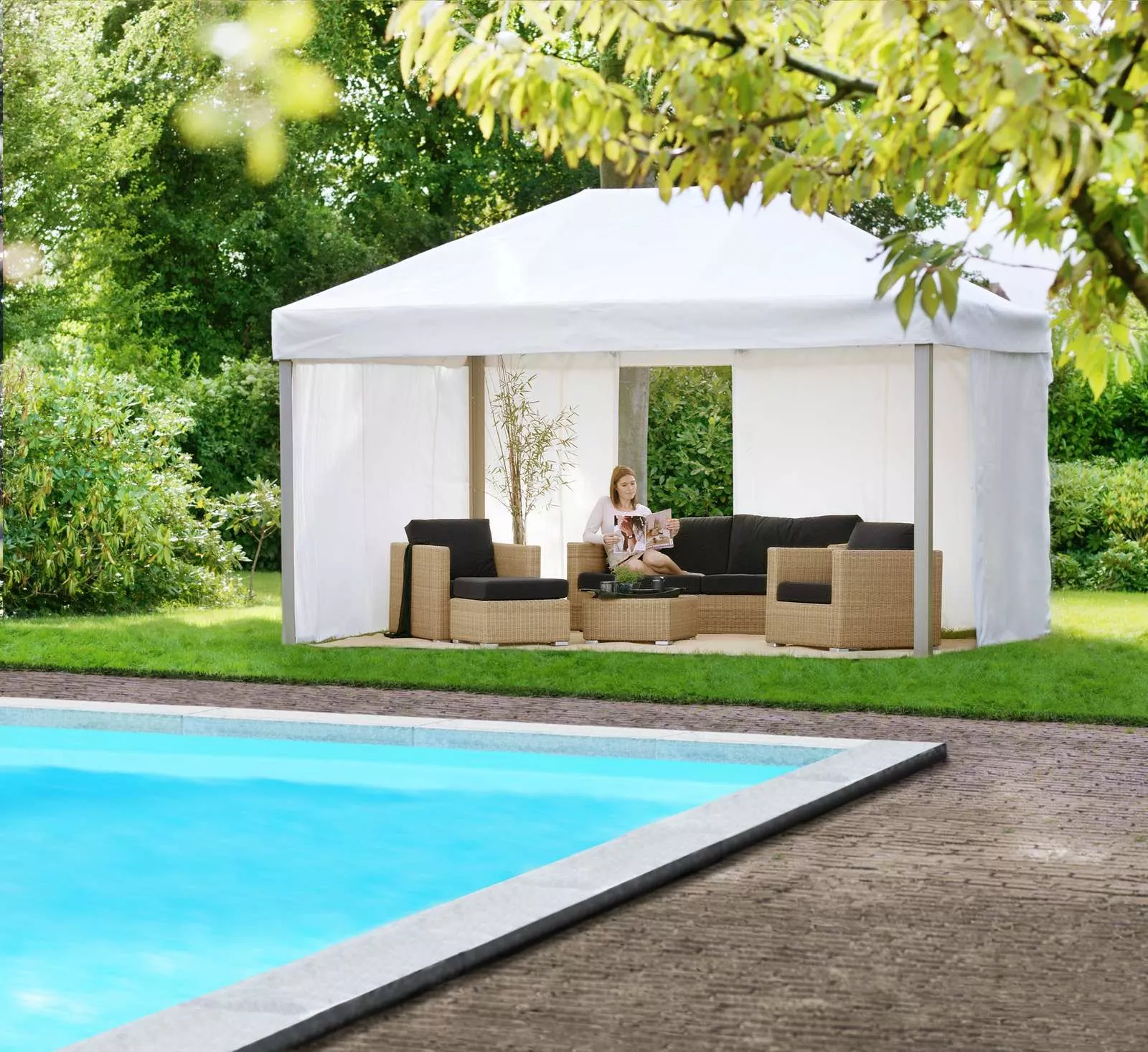 Dank der robusten Materialien kann diese Gartenlounge das ganze Jahr über draußen stehen bleiben. Für eine einfache Reinigung im Frühjahr empfehlen wir jedoch die Verwendung eines Überzugs.