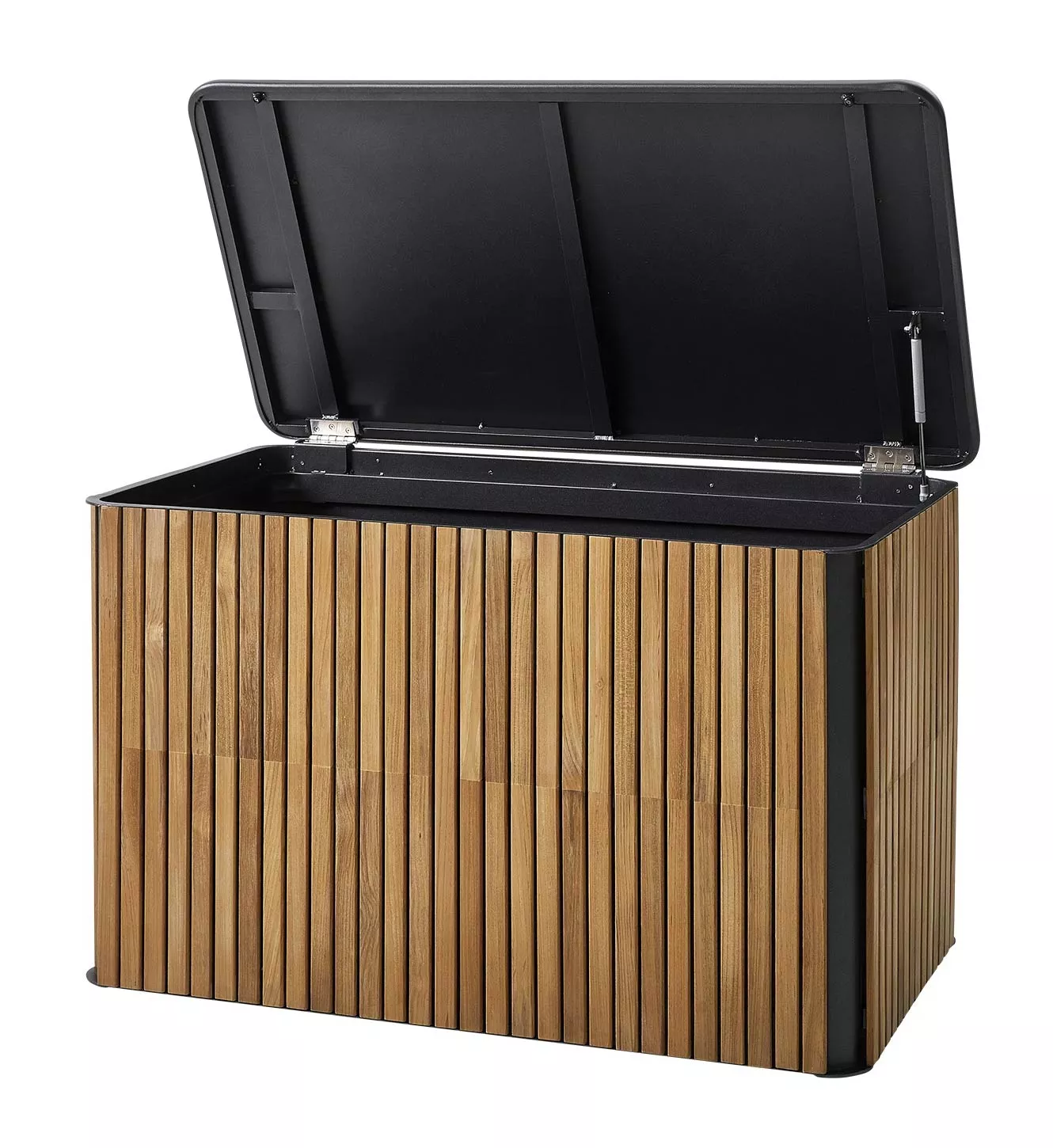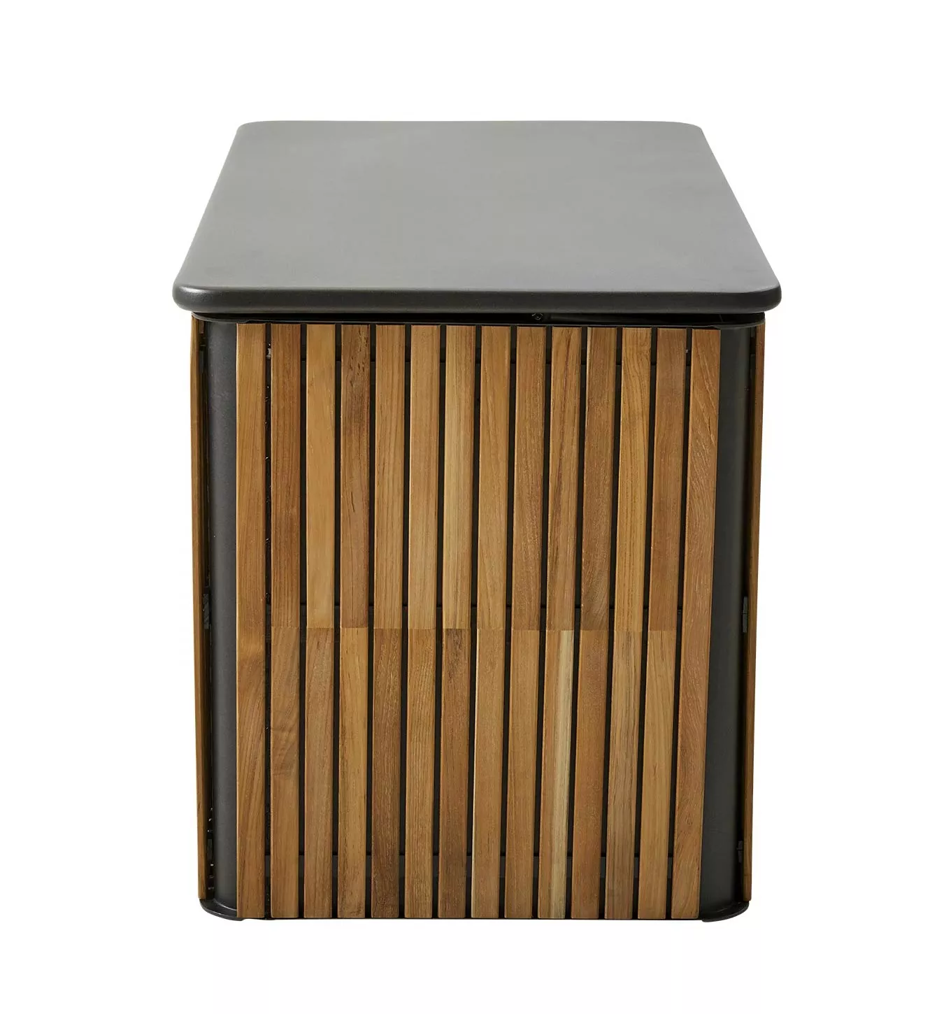 Die Combine Kissenboxen von Cane-line bieten geräumige Aufbewahrungslösungen für den Außenbereich. Aus pulverbeschichtetem Aluminium in Lavagrau und Teakholzlamellen gefertigt, sind sie sowohl praktisch als auch ästhetisch ansprechend.