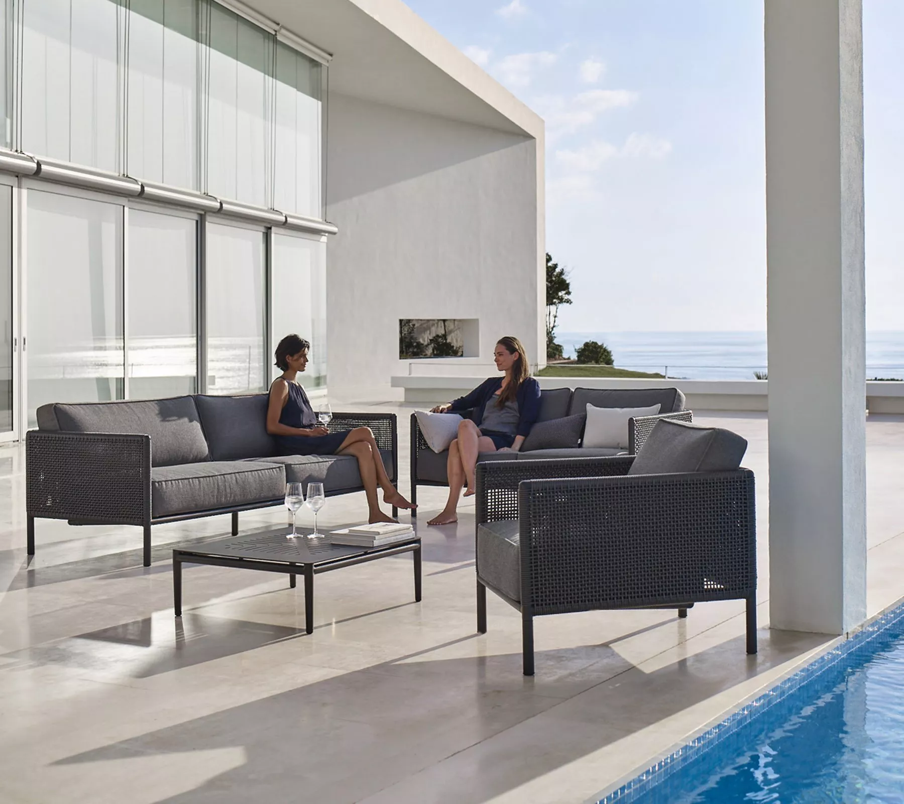 Das Encore 2-Sitzer-Sofa besticht durch sein zeitloses Design und seine nahtlose Integration in jeden Außenbereich. Es ist aus strapazierfähigem Cane-line Soft Rope gefertigt und mit Cane-line AirTouch Kissen ausgestattet, die mit QuickDryFoam® gefüllt sind. Dadurch bietet das Sofa höchsten Komfort. Dank des Cane-line QuickDry- & Airflow-Systems sind die Sitzkissen auch nach einem Regenschauer innerhalb etwa einer Stunde wieder trocken.