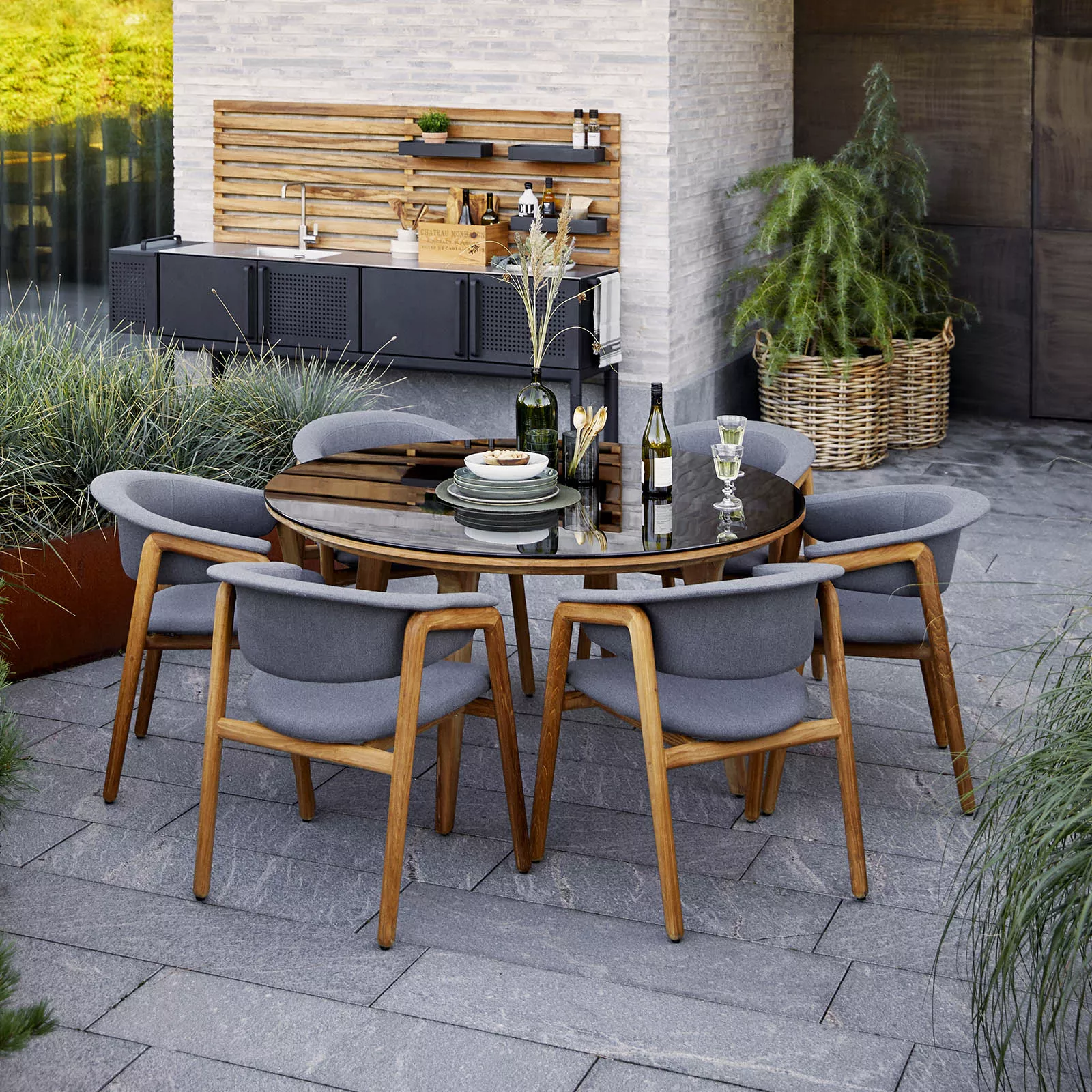 Cane-line Joy Gartentisch mit Aluminiumbeinen | Esstisch Joy Ø 140 cm Cane-line Katalog Der Tisch Joy Ø144 cm besticht durch seine eleganten, klaren Linien und eine schlichte, vollendete Formensprache. Die Serie umfasst eine Kollektion stilvoller Esstische für den Außenbereich. Das Untergestell von Joy verleiht der Serie einen einzigartigen Ausdruck und überzeugt durch seine konischen Tischbeine aus Aluminium sowie die geschwungene Form. Die Tische der Serie sind sowohl in runder als auch rechteckiger Ausführung sowie in dunklen und hellen Farbvarianten erhältlich. Produkteingenschaften • Amuminiumbeine • Tischplatte: HPL, Keramik, Teakholz • Gegen Aufpreis: Fossil Keramik Tischplatte • Materialien wetter- und lichtbeständig • Hohe Hitze- und Kältebeständigkeit • Sowohl im Innen- als auch im Außenbereich einsetzbar • Wartungsarm und pflegeleicht Maße (Ø × H) Ø 140 × 73 cm