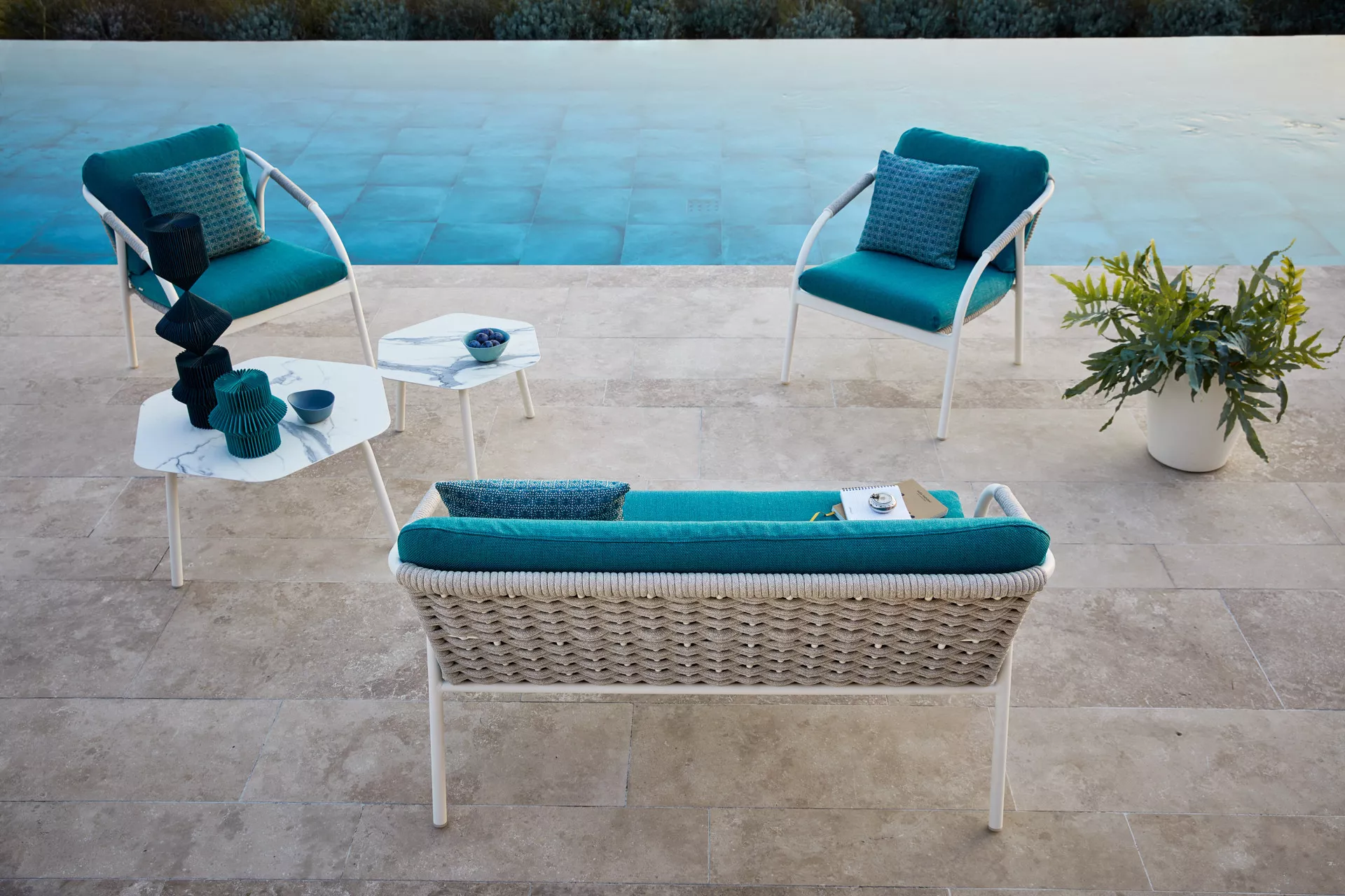 Hergestellt mit pulverbeschichtetem Aluminiumgestell, bespannt mit rundem Searope Kunststoffgeflecht. Wertvolle Materialien und moderne Silhouetten machen diese Kollektion einzigartig und luxuriös. Der gemütliche Sitz sorgt für den vollkommenen Komfort, die dynamischen Formen erlauben es, mit den umgebenden Räumen zu spielen und sie zu ergänzen. Perfekt geeignet für die Innen- und Außeneinrichtung von Wohn- und Objektprojekten