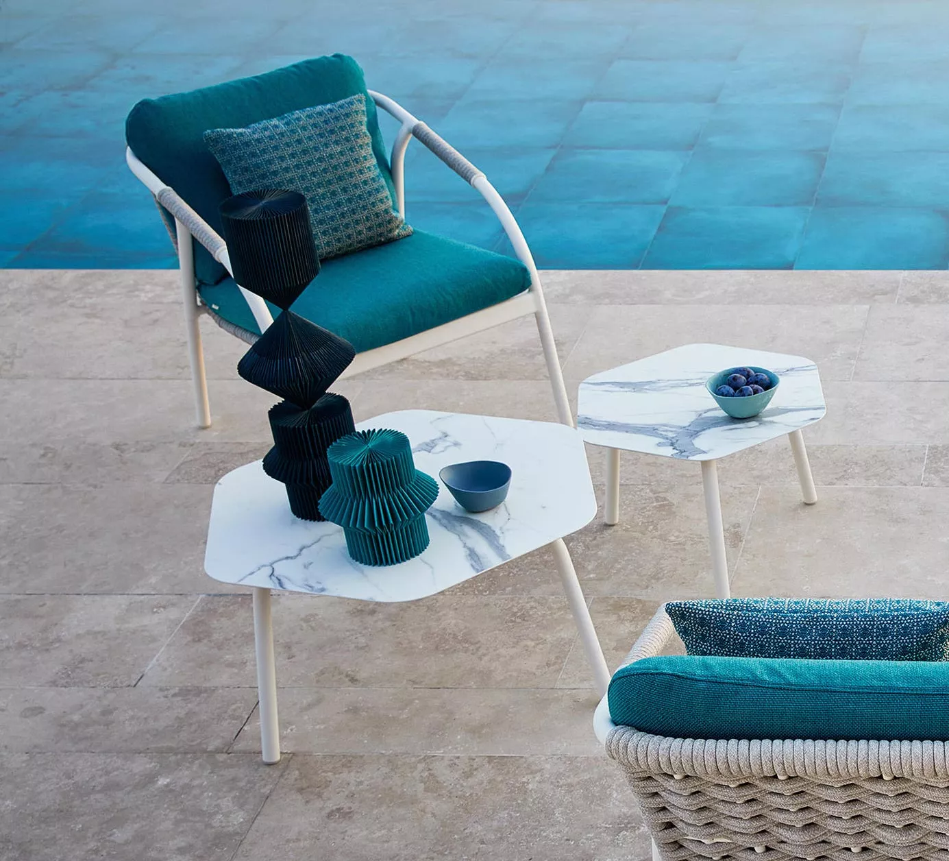 Hergestellt mit pulverbeschichtetem Aluminiumgestell, bespannt mit rundem Searope Kunststoffgeflecht. Wertvolle Materialien und moderne Silhouetten machen diese Kollektion einzigartig und luxuriös. Der gemütliche Sitz sorgt für den vollkommenen Komfort, die dynamischen Formen erlauben es, mit den umgebenden Räumen zu spielen und sie zu ergänzen. Perfekt geeignet für die Innen- und Außeneinrichtung von Wohn- und Objektprojekten