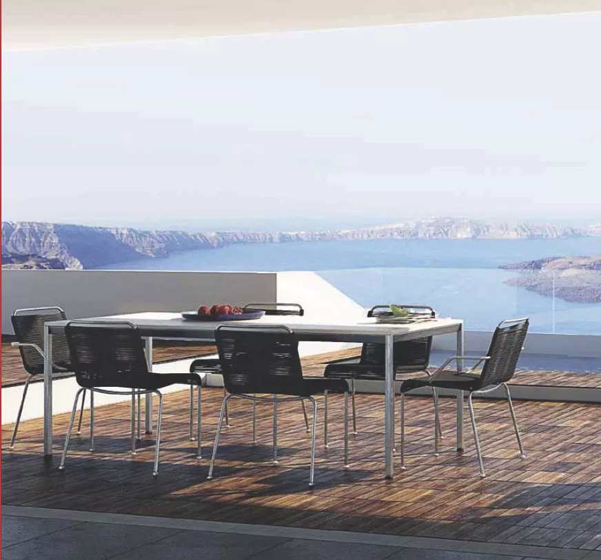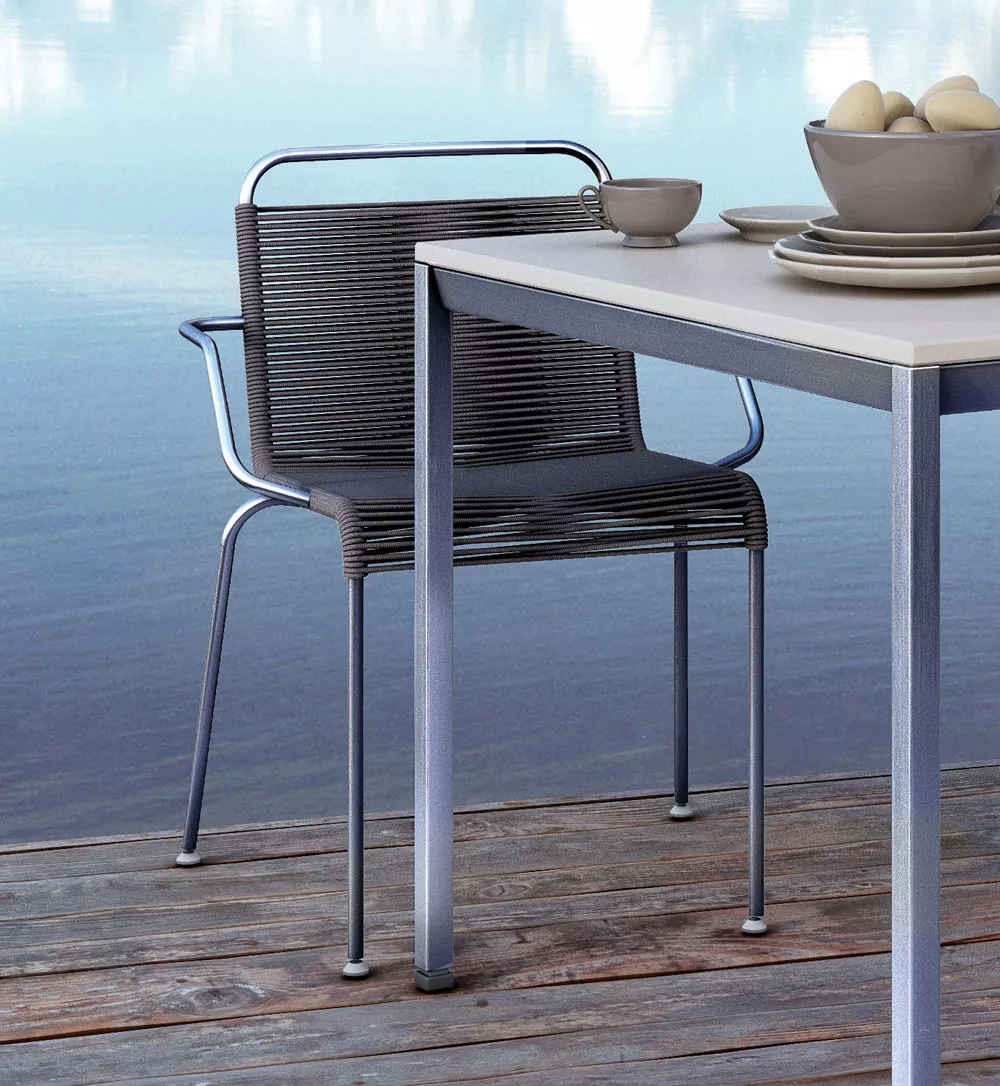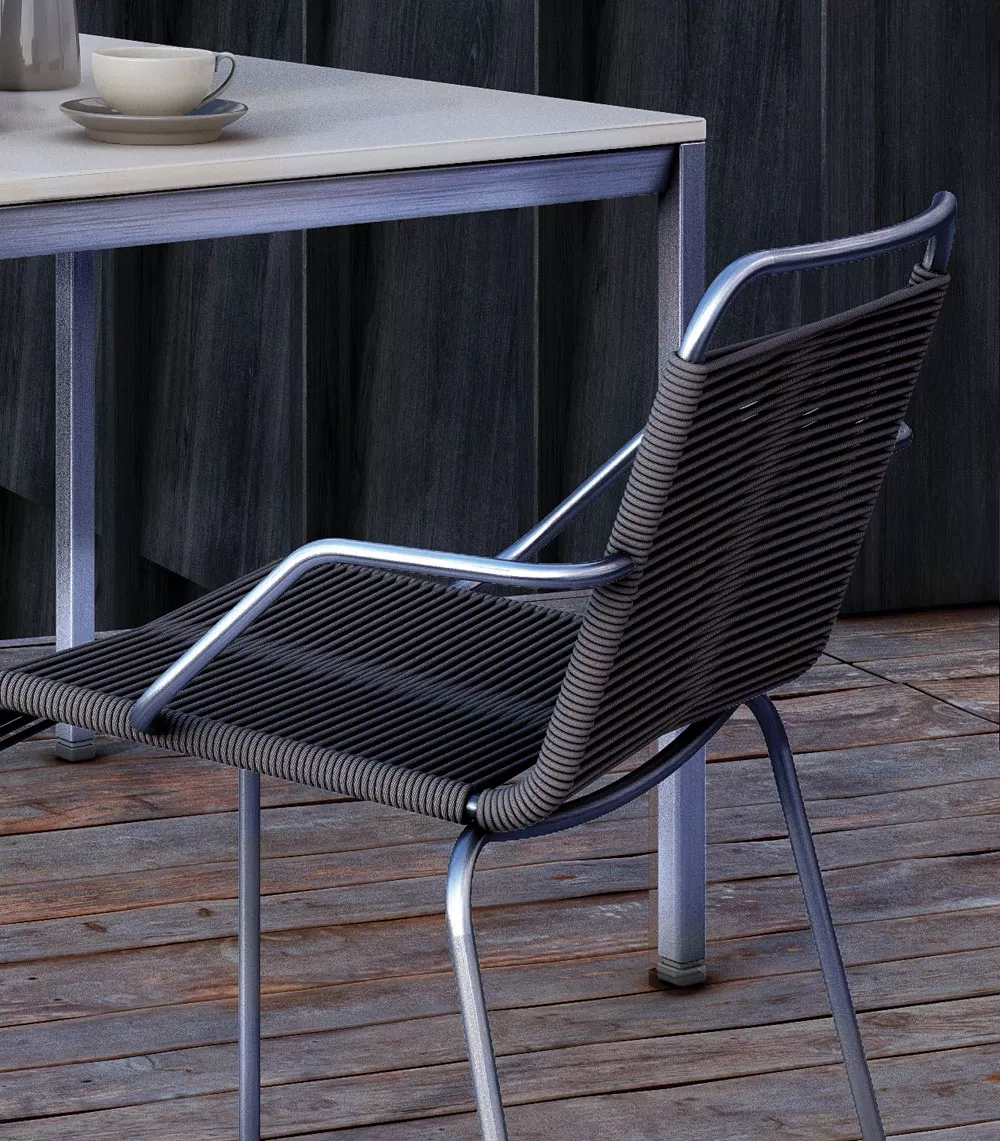 In architektonisch klarem, urbanem Design zeigt sich die Kollektion Jubeae von Coro. Das Outdoor Gartenmöbel Jubeae stellt eine spannende Kombination von exzellent verarbeitetem Edelstahl und hochwertigem, wetterfestem Kunststoffgeflecht dar. Die geflochtene Rückenlehne besteht aus einer Acryl Schnur, gespannt auf einem Gestell aus gebürstetem Edelstahl. Die Kollektion Jubeae bietet Stühle (mit oder ohne Armlehnen), Loungesessel und Loungetische mit Edelstahlgestell und Aluminium Tischplatte. Sitze und Rückenlehnen sind entweder mit verstärkter PVC Nylonschnur oder Acrylschnur (in verschiedenen Farben) gefertigt. Produkteigenschaften- Gestell aus Edelstahl gebürstet oder weiß lackiert