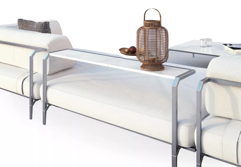 Coro Sabal Loungesofa 232 cm • Coro Sabal Gartenmöbel In architektonisch klarem, urbanem Design zeigt sich die Kollektion Sabal von Coro. Das Outdoor Gartenmöbel Sabal stellt eine spannende Kombination von exzellent verarbeitetem Edelstahl und hochwertigen, wetterfesten Stoffen dar. Die Rückenlehne besteht aus wetterfestem Garden Stoff, das Gestell aus Edelstahl (gebürstet). Durch den modularen Aufbau sind vielfältige Kombinationsmöglichkeiten gegeben. Die praktischen Beistelltische bieten viel Ablagefläche. The collaborative venture between Matteo Nunziati and CORO continues. This year, the designer is offering us SABAL, a range of sofas with a neat and strikingly simple appearance. The idea grew from the desire to conceive a product not just as a separate item but in the context of its relationship with the surroundings and multiple functions of the Outdoor living area. SABAL is not just a sofa but a complete seating system where formal and informal seats alternate with small coffee tables. It has been conceived as the focal point for convivial gatherings but also as a corner for relaxation and rest. The wide range of configurations for the seats can satisfy every type of requirement for open spaces, from a private terrace to a large garden, from the public open area of a hotel to a spa or a lounge. The multiple variations in the modular combinations of the sofas are rendered even more extensive and complete thanks to the finishes for the coffee tables which can be requested in marble, glass or Corian® combined with the infinite variety of Coro fabrics for outdoor use, which are offered in matching textures and colours, and whose combinations accommodate the current demands to be able to give free rein to the modern-day passion for relaxation. As a result SABAL can be fashioned and interpreted in a thousand different ways. The importance of finding the right shape for various objects is evident in the way that the small details convey the carefully judged visual impact of the product. The relationship between an object and its surroundings has become increasingly important in determining the quality of what we “design” and “plan”; using a light touch ensures we obtain a creative mix of good taste and balance. Gestell aus Edelstahl gebürstet Kissen Polsterung aus Polyurethan Dryfeel abnehmbarer Garden Stoffbezug hochwertiger Edelstahl Qualität 316 / See- und Salzwasserfest wetterfeste Stoffe leicht zu reinigen Kissen-Set 3 Stück • Dekokissen/Rückenkissen: 1 Stück 50 x 50 cm 1 Stück 60 x 60 cm 1 Stück 70 x 70 cm1 Stück 50 x 30 cm Maße: (B × T × H) 232 × 119 × 56/71 cm