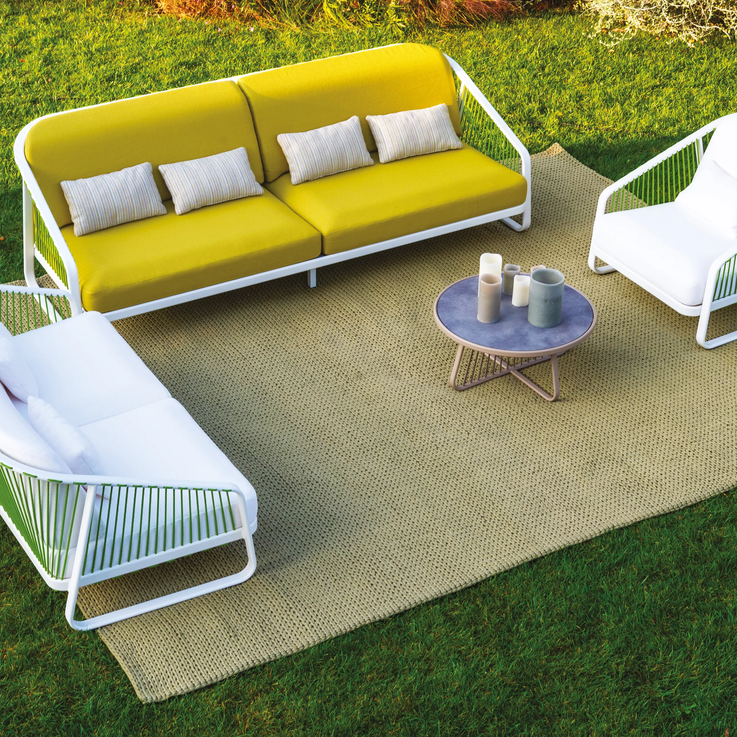 Sally entstand aus der Idee, eine Outdoor-Möbelkollektion zu kreieren, die neue konstruktive und formale Lösungen einführt: Eine leichte und elegante Aluminiumstruktur wird durch das innovative Design der Schnur, die in den Rahmen ein- und ausgeht, bereichert, wodurch eine neue Zugstruktur entsteht. Sally steht nicht für ein einzelnes Produkt, sondern für eine artikulierte Familie, die zeitgenössisches Wohnen mit einem starken und erkennbaren Zeichen interpretiert.