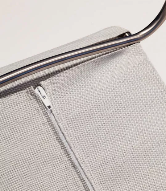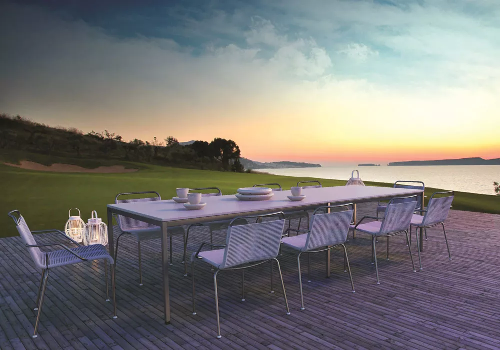 In architektonisch klarem, urbanem Design zeigt sich die Kollektion Jubeae von Coro. Das Outdoor Gartenmöbel Jubeae stellt eine spannende Kombination von exzellent verarbeitetem Edelstahl und hochwertigem, wetterfestem Kunststoffgeflecht dar. Die geflochtene Rückenlehne besteht aus einer Acryl Schnur, gespannt auf einem Gestell aus gebürstetem Edelstahl. Die Kollektion Jubeae bietet Stühle (mit oder ohne Armlehnen), Loungesessel und Loungetische mit Edelstahlgestell und Aluminium Tischplatte. Sitze und Rückenlehnen sind entweder mit verstärkter PVC Nylonschnur/Acrylschnur (in verschiedenen Farben) oder SUN Gewebe gefertigt. Produkteigenschaften- Kissen mit Garden Stoff