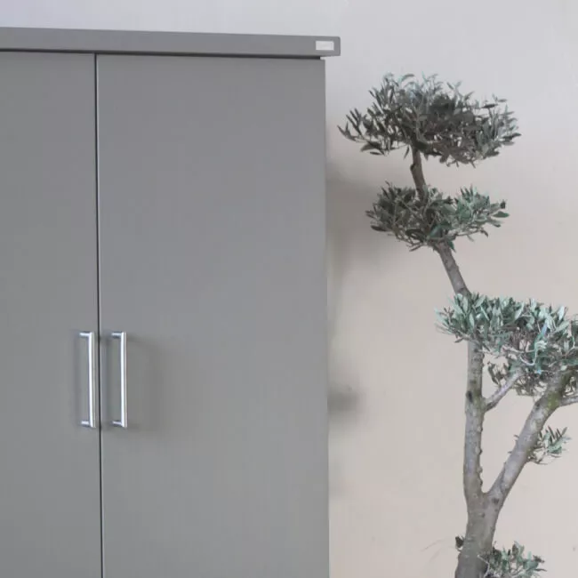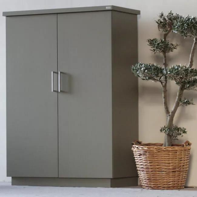 Schrank Cubic 129 cm oder 189 cm von Herrenhaus aus witterungsbeständigen Materialien mit höhenjustierbaren Füßen und optionalem Schloss. Das Gestell der Cubic Schränke ist seidenmatt lackiert und in mehreren Farben erhältlich.