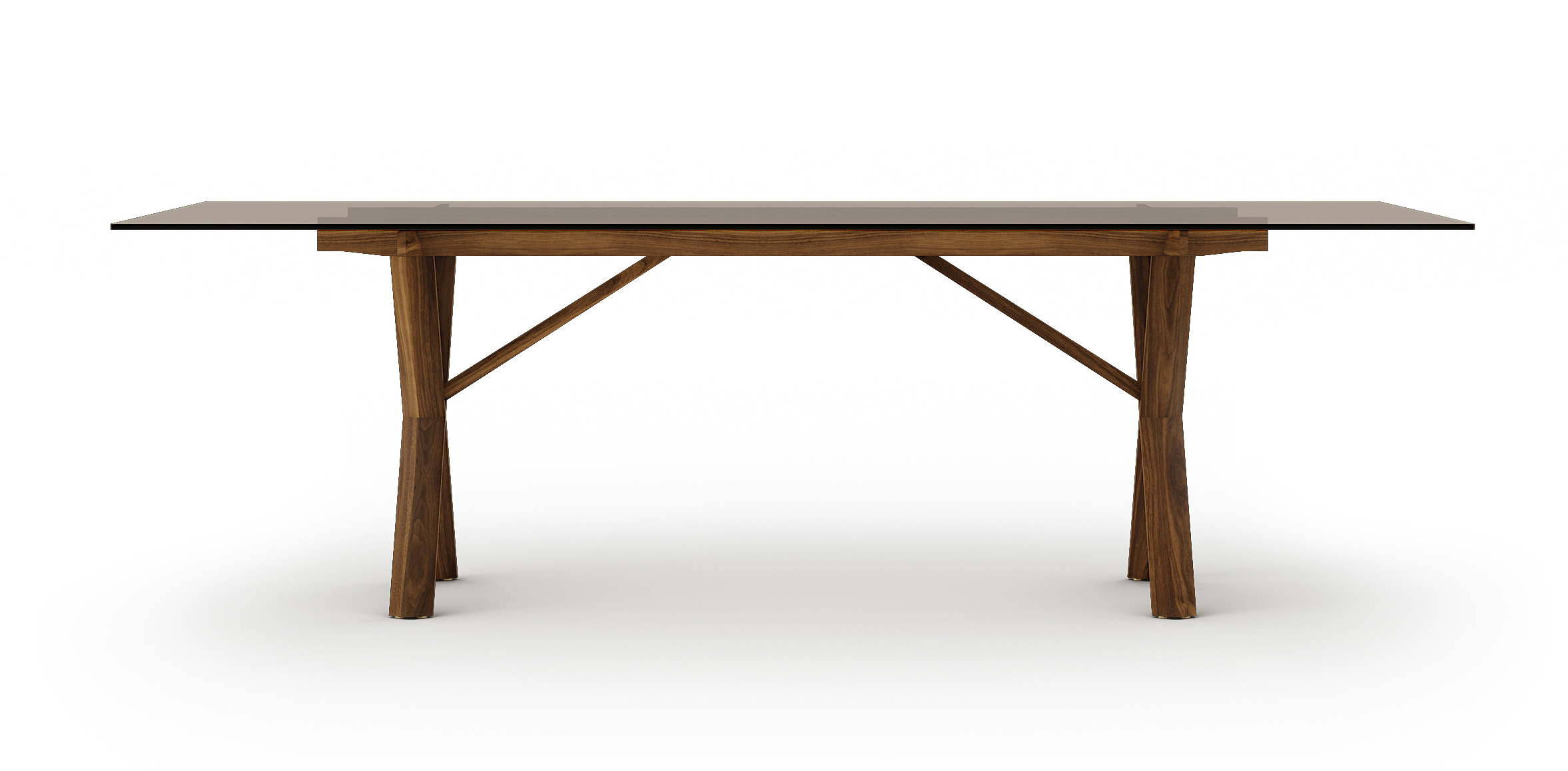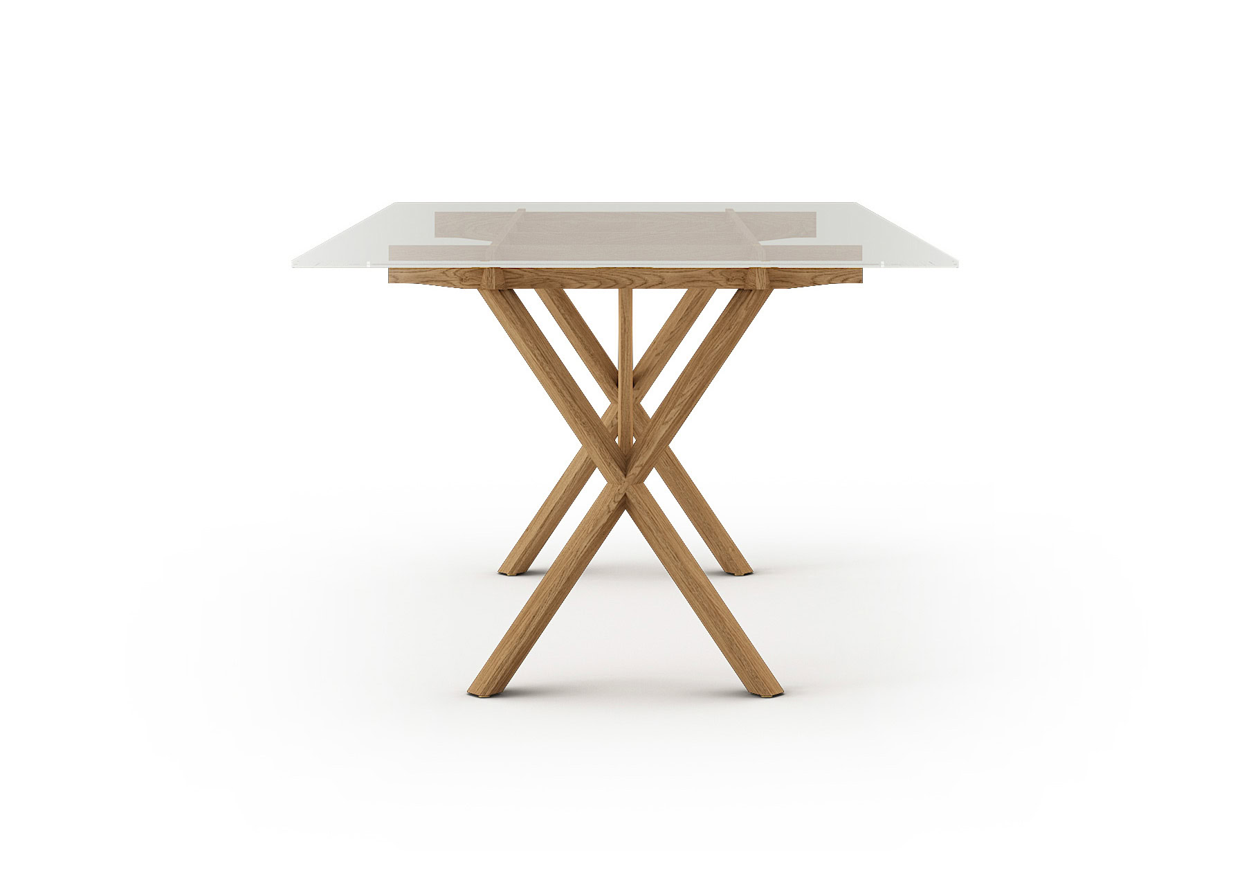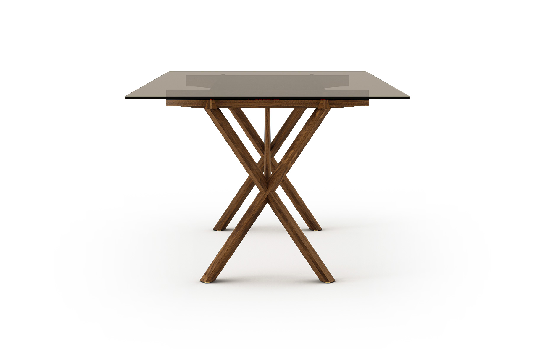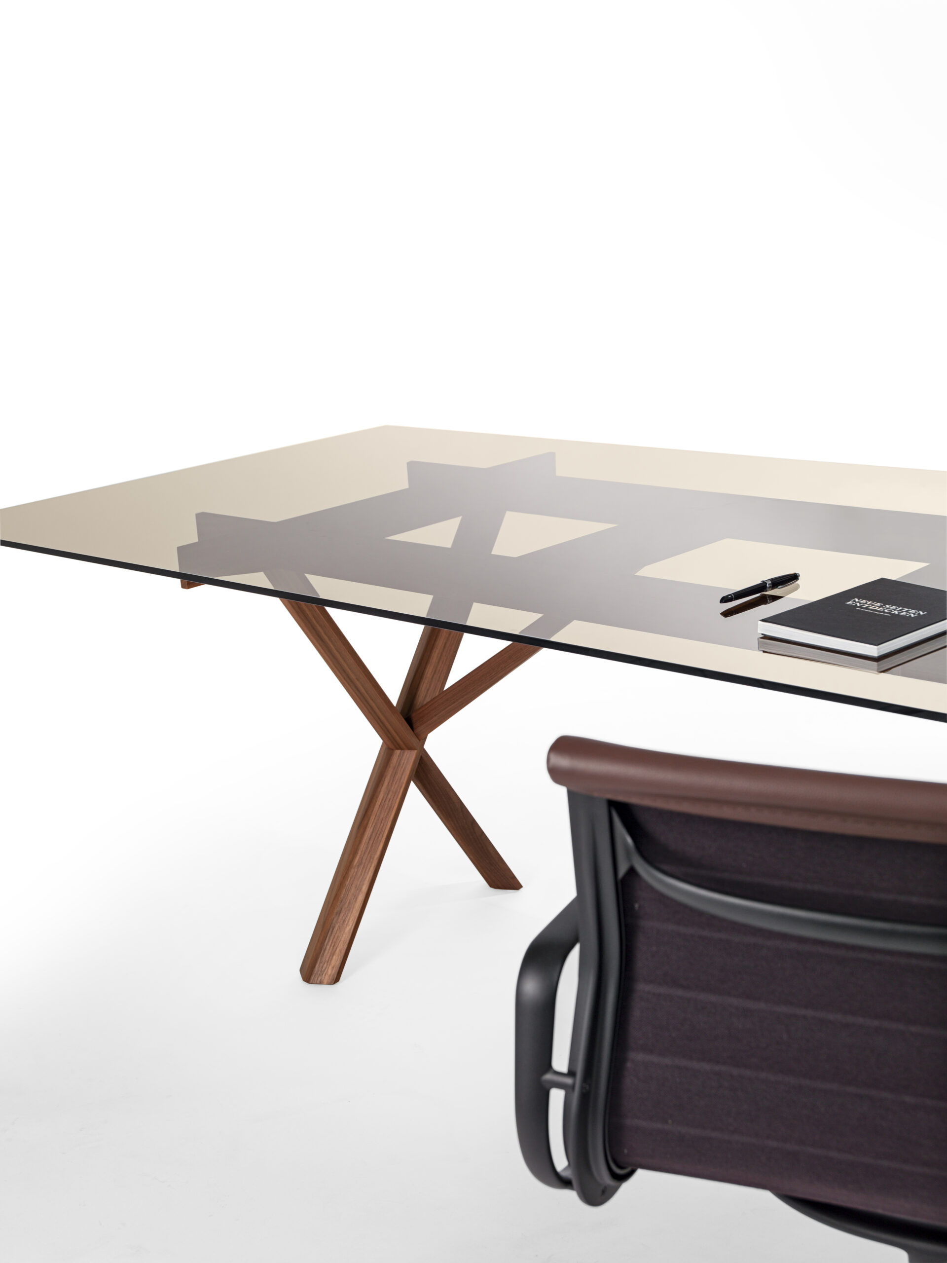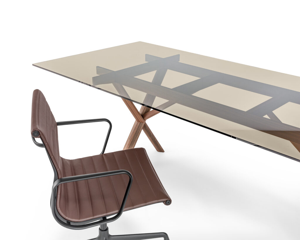 Der SQUELETTE Tisch von Mobimex, entworfen von Dante Bonuccelli, stellt das Untergestell bewusst ins Zentrum der Gestaltung und macht daraus das eigentliche Designstatement. Statt im Hintergrund zu bleiben, wird die Konstruktion aus Massivholz zum prägenden Blickfang: Fein ausgearbeitete X-Streben verbinden Quer- und Längsbalken des Rahmens, wirken als präzise gesetzte Abstandhalter und tragen gemeinsam die elegante Glasplatte. Das Zusammenspiel aus transparenter Oberfläche und filigraner Holzstruktur lässt ein spannungsvolles Wechselspiel aus Leichtigkeit und Stabilität entstehen. Mit seiner meisterhaften handwerklichen Ausführung und der klaren architektonischen Formsprache ist der SQUELETTE Tisch ein ausdrucksstarkes Möbelobjekt, das Design, Konstruktion und Materialästhetik auf höchstem Niveau vereint.