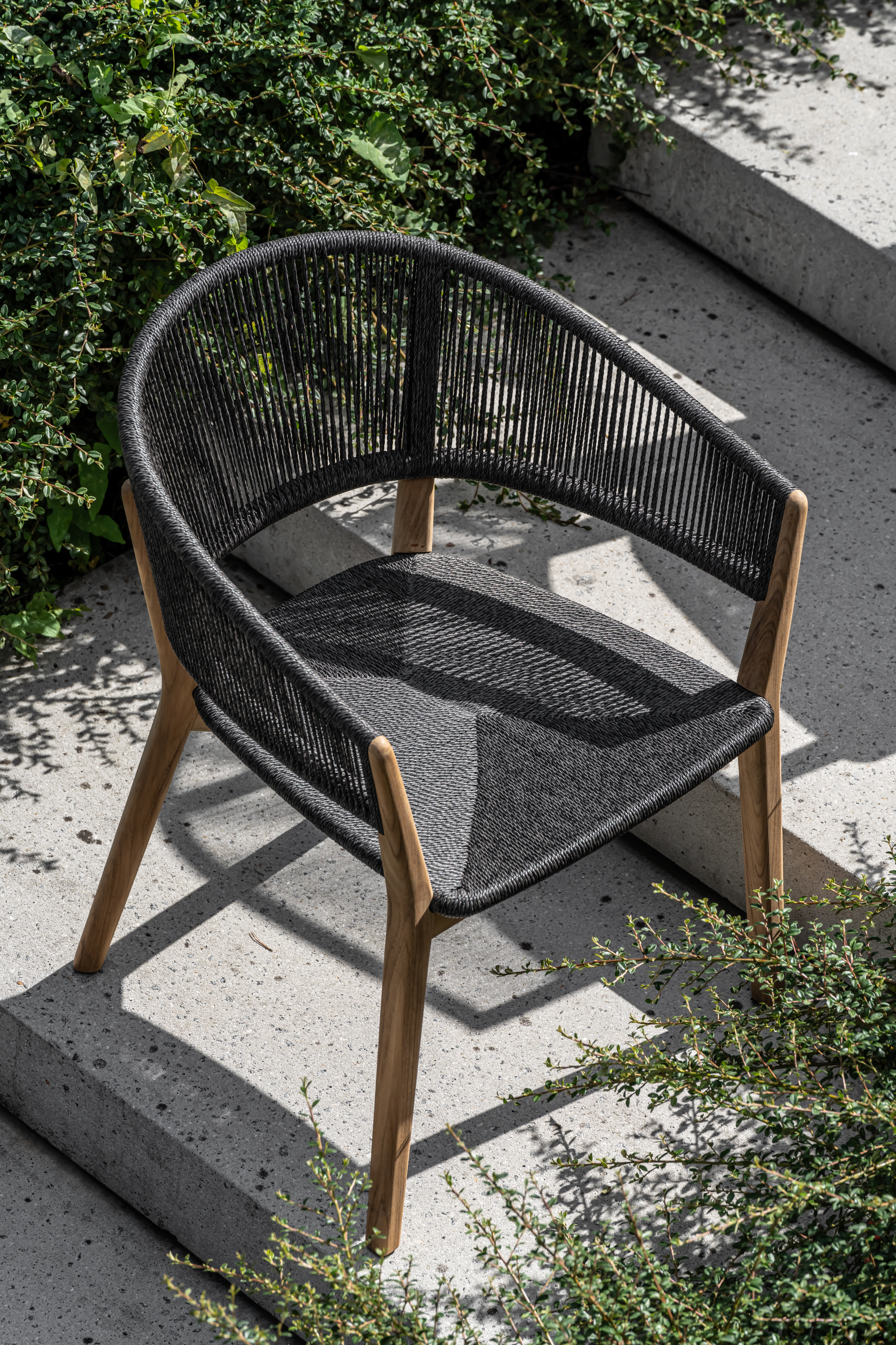 Royal Botania Cordiz Gartenstuhl Der Cordiz Gartenstuhl von Royal Botania bringt spürbare Leichtigkeit in den Outdoor-Bereich: schlanke Aluminiumbeine tragen eine massive Teak-Sitzfläche und schaffen so einen eleganten Kontrast aus warmem Naturholz und präziser Verarbeitung. Die Rückenpartie wird durch feine Flechtkordeln geprägt, die in sanften, geometrischen Linien Struktur und Charakter geben – offen, modern und trotzdem einladend. Cordiz ist für den Alltag im Freien gemacht: Der Stuhl ist leicht zu bewegen und stapelbar – ideal für Terrasse, Garten oder anspruchsvolle Objektbereiche, in denen Komfort und Flexibilität genauso wichtig sind wie ein hochwertiger Look. Sleekes Aluminiumgestell mit warmer Teak-Sitzfläche Rückenlehne mit feinen Kordeln in geometrischer Linienführung Leicht zu bewegen und stapelbar Ideal für private Terrassen sowie Hospitality & Dining Maße (B × T × H): 63 × 59 × 78 cm Sitzhöhe: 45 cm