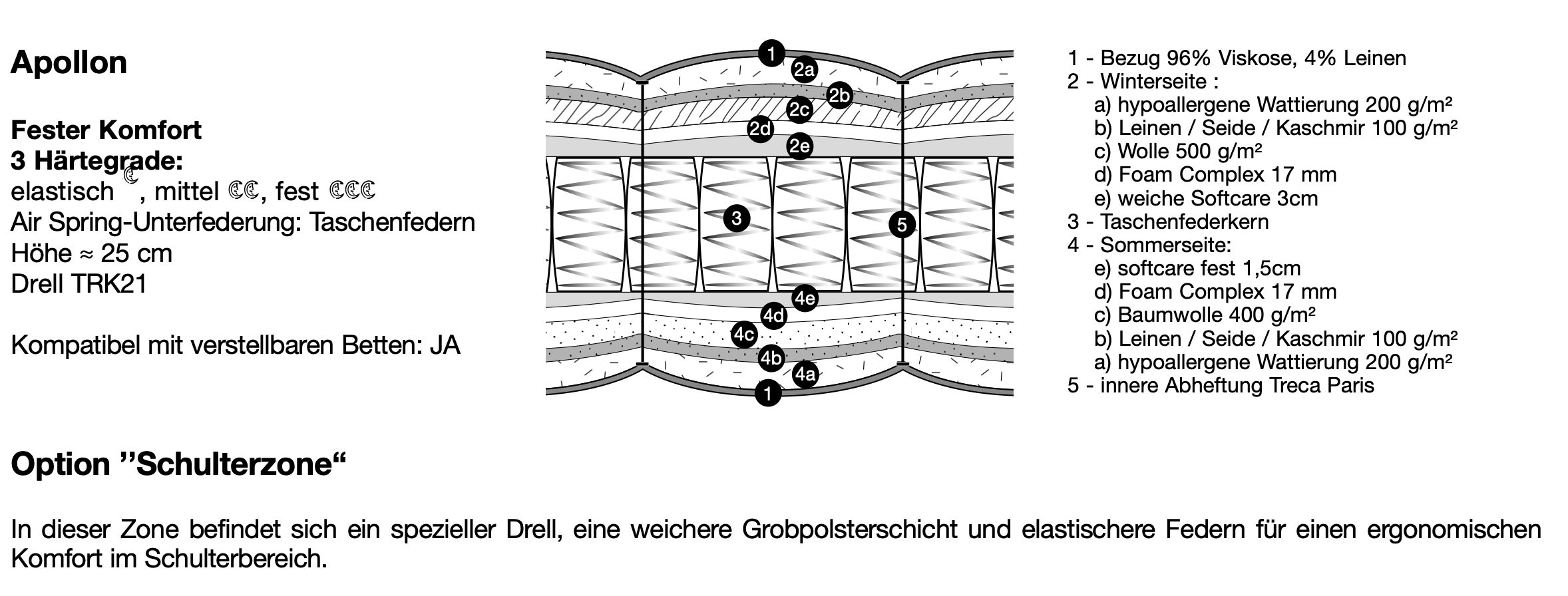 TRECA PARIS Impérial Apollon • ObermatratzeTreca Paris Schlaftabelle Mit Tréca betreten Sie ein Universum, in dem all Ihre Träume wahr werdenTréca pflegt sein Know-how über Generationen hinweg, um Ihnen den besten Schlaf zu bieten. Tréca verspricht Ihnen ein Haute-Couture-Erlebnis und begleitet Sie bei der Verwirklichung Ihrer Innenarchitektur- und Dekorationsprojekte: Schlafzimmer, komplette Villen, Gästehäuser, Hotelprojekte, Elternsuiten, Yachten... Tréca ist mehr als nur eine Matratze oder ein Bett, es ist ein Lifestyle, eine art de la chambre. Jedes Detail zählt, um die Perfektion zu erreichen. Exklusiv handgefertigt in Frankreich, sorgfältig genäht, gepolstert und gepackt, erfordert die Anfertigung einer Matratze die Beherrschung vieler Fertigkeiten, vor allem jedoch braucht es Zeit. Zeit ist kostbar, um jede Matratze zu einem Meisterwerk französischer Handwerkskunst zu machen. Perfekt in jeder Hinsicht, in jedem Detail. Bei Tréca wird alles sorgfältig durchdacht und entworfen. Tréca legt großen Wert auf die Auswahl edler, natürlicher und langlebiger Materialien und suchen sie dort, wo sie am feinsten sind. Natürliche Fasern, die über die Zeit hinweg beständig sind, resilient, glatt, seidig… das sind die Eigenschaften, die die Matratzen von Tréca außergewöhnlich machen.Die Impérial Apollon ist der neueste Zugang der Impérial-Kollektion und vereint natürliche Materialien mit eleganter Verarbeitung zu einem rundum ausgewogenen Schlafkomfort. Feine Naturmaterialien wie Wolle und Baumwolle sorgen für ein angenehmes, ausgeglichenes Schlafklima und unterstützen idealen thermischen Komfort – Nacht für Nacht. Als „kleiner Bruder“ der Impérial Air Spring® überzeugt die Apollon mit natürlicher Eleganz, hochwertiger Qualität und einem besonders harmonischen Liegegefühl. Für noch mehr individuellen Komfort ist sie optional mit einer weicheren Schulterkomfortzone erhältlich, die den Schulterbereich ergonomisch entlastet und die Unterstützung zusätzlich verbessert.Merkmale "Impérial Apollon": Härtegrad: elastisch, mittel, festKomfort: Dynamisch Verstellbar bei passenden UnterbauHöhe / Stärke: 25 cm Polsterung: Komplett Federung: Air Spring®Handgenäht in FrankreichHochwertige Verarbeitung für langlebige Qualität Elegantes Design aus dem Hause Tréca Edle und natürliche Materialien: Wolle, Softcare weich und fest, hypoallergene Wattierung, Leinen-Seide-Kaschmir, BaumwolleBezugsstoff: 96 % Viskose – 4 % Leinen 5 bestickte Griffe und 4 Belüftungsösen Optionen: SchulterkomfortzoneGerne bieten wir Ihnen auf Anfrage eine Auswahl weiterer Stoffe, Matratzengrößen und weitere Sonderoptionen wie Reißverschlüsse an. Kontaktieren Sie uns telefonisch oder per E-Mail – unser Team berät Sie individuell und kompetent.Air Spring®-Tonnentaschenfedern: Die flexibel gelagerten Federn sorgen für hervorragende Bewegungsunabhängigkeit und passen sich dank ihres progressiven Komforts sanft jeder Schlafbewegung an. Option Schulterzone: Entlastung des Schulterbereichs durch eine auf dieses Niveau abgestimmte Federung, eine exklusive Polsterung und Auflage. Für optimalen Komfort sind die Federn in diesem Bereich weicher. Drell: Der sichtbare Teil der Matratze, der Stoff, der die Matratze umhüllt und schützt (Leinen: Französisches Leinen aus Nordfrankreich und der Normandie hergestellt. Nachhaltig produziert und ausgezeichnet mit dem Label Entreprise du Patrimoine Vivant).