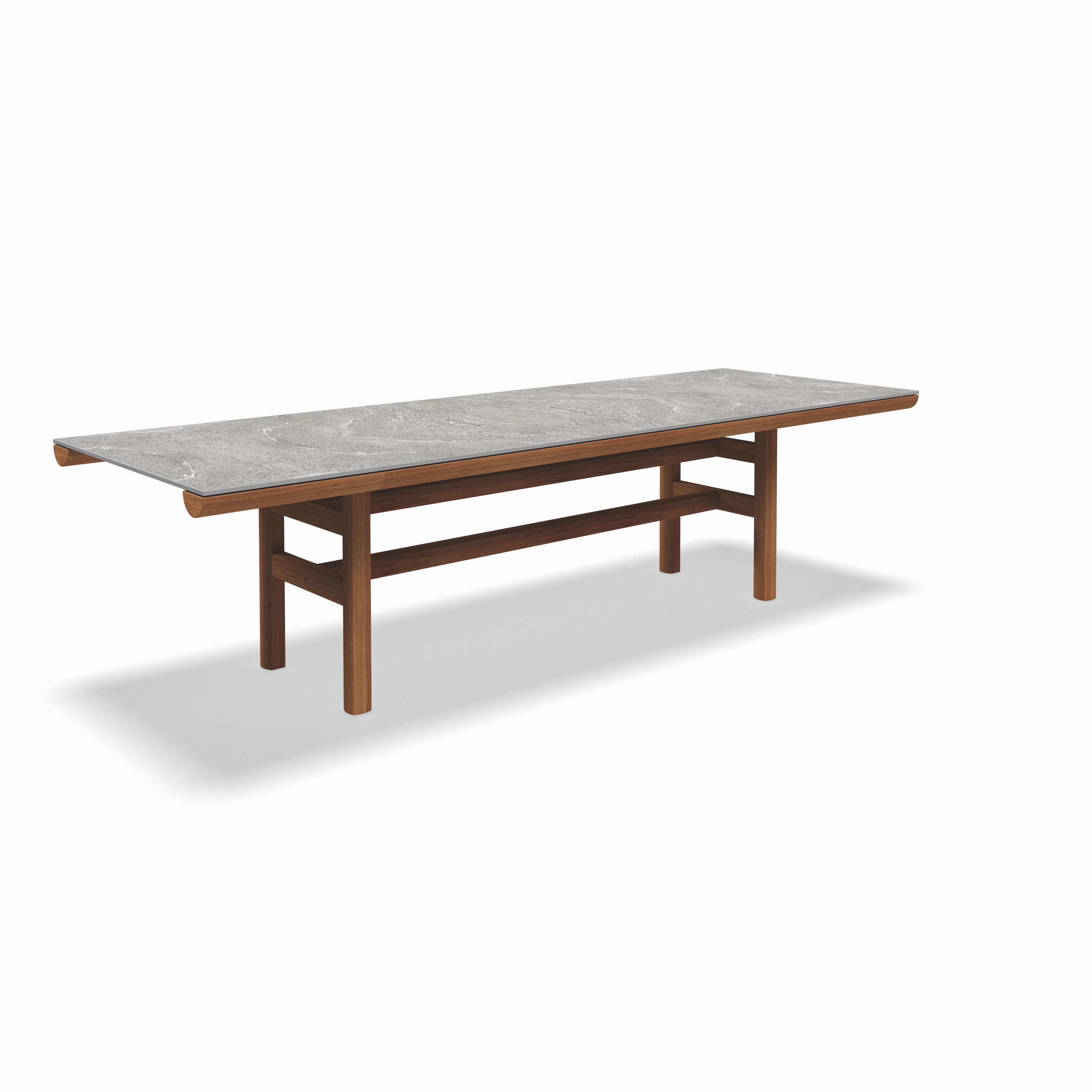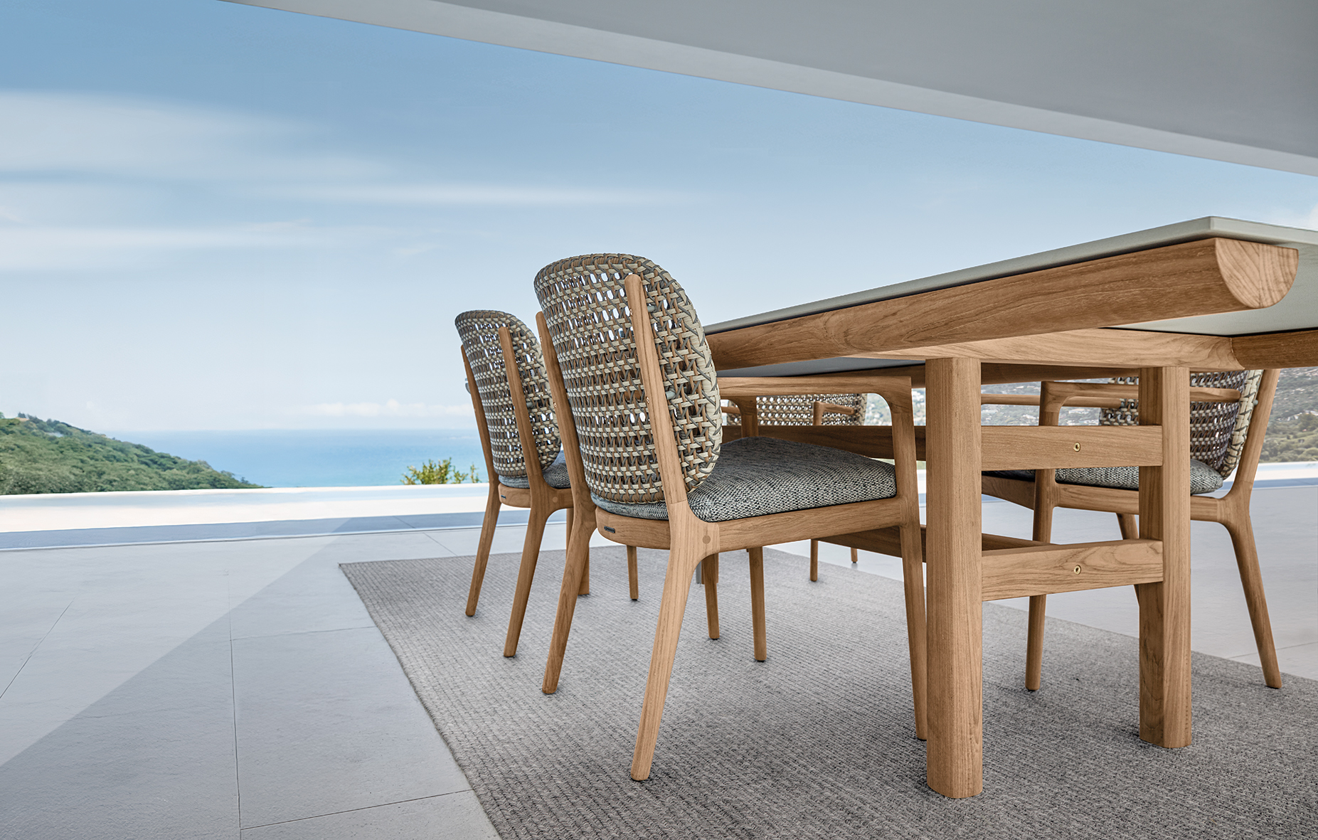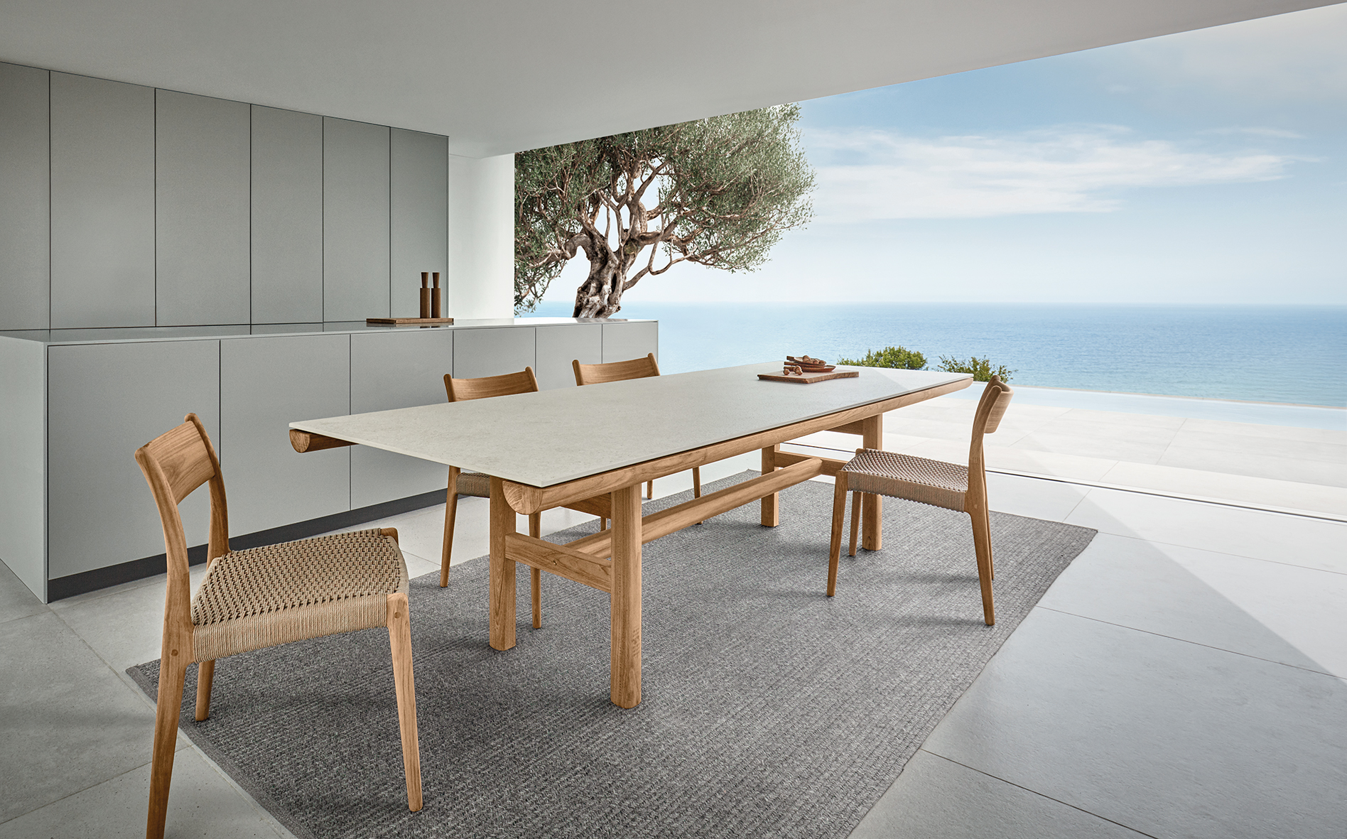 Die Rail Kollektion von Gloster steht für ruhige, präzise Outdoor-Architektur: Ein Rahmen aus naturbelassenem Teak trägt eine einteilige Keramik-Tischplatte und wirkt dabei bewusst reduziert, stabil und zeitlos. Rail ist als großzügiger Esstisch konzipiert – ein klarer Mittelpunkt für Terrasse, Garten und anspruchsvolle Hospitality-Settings.