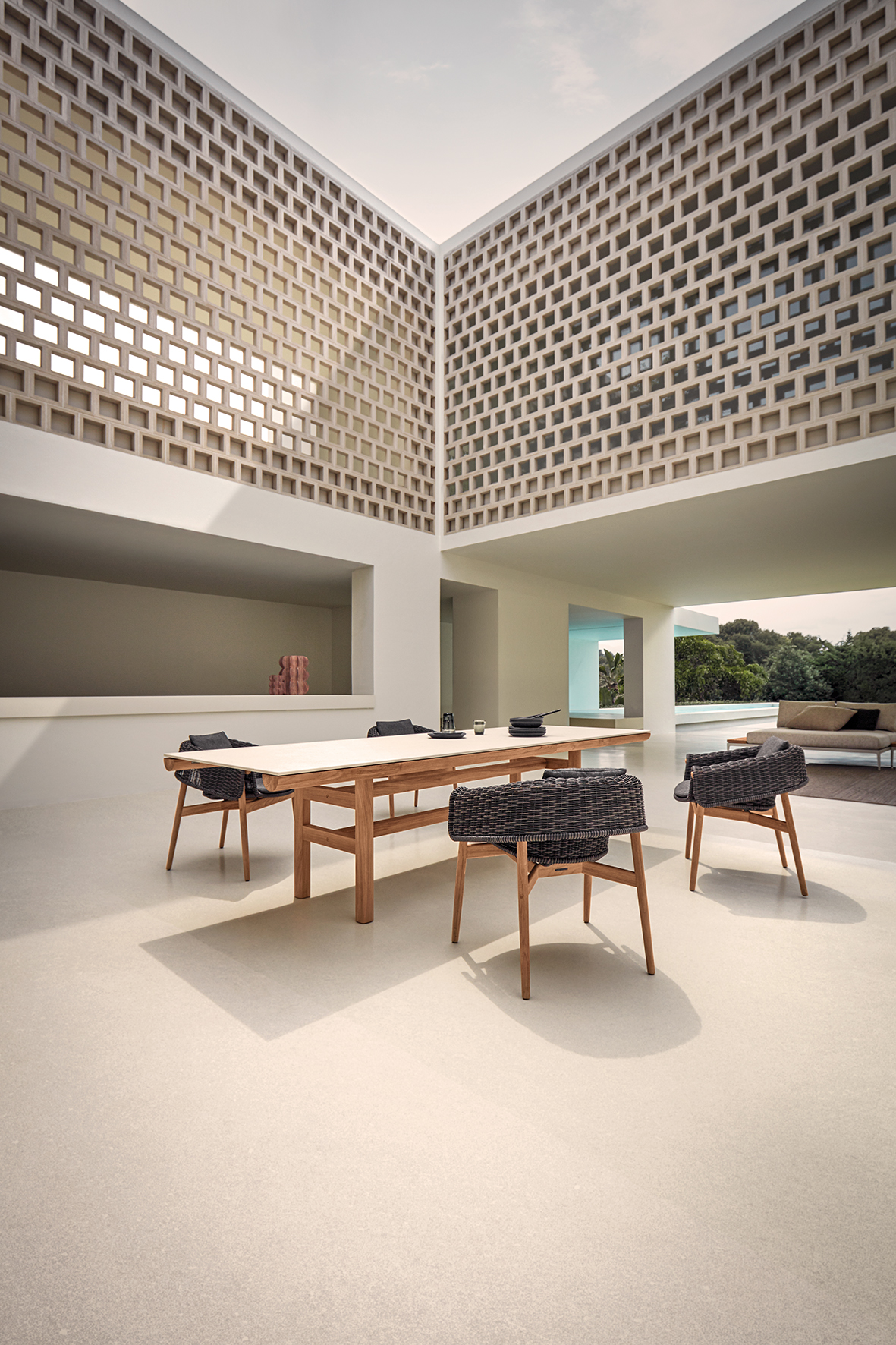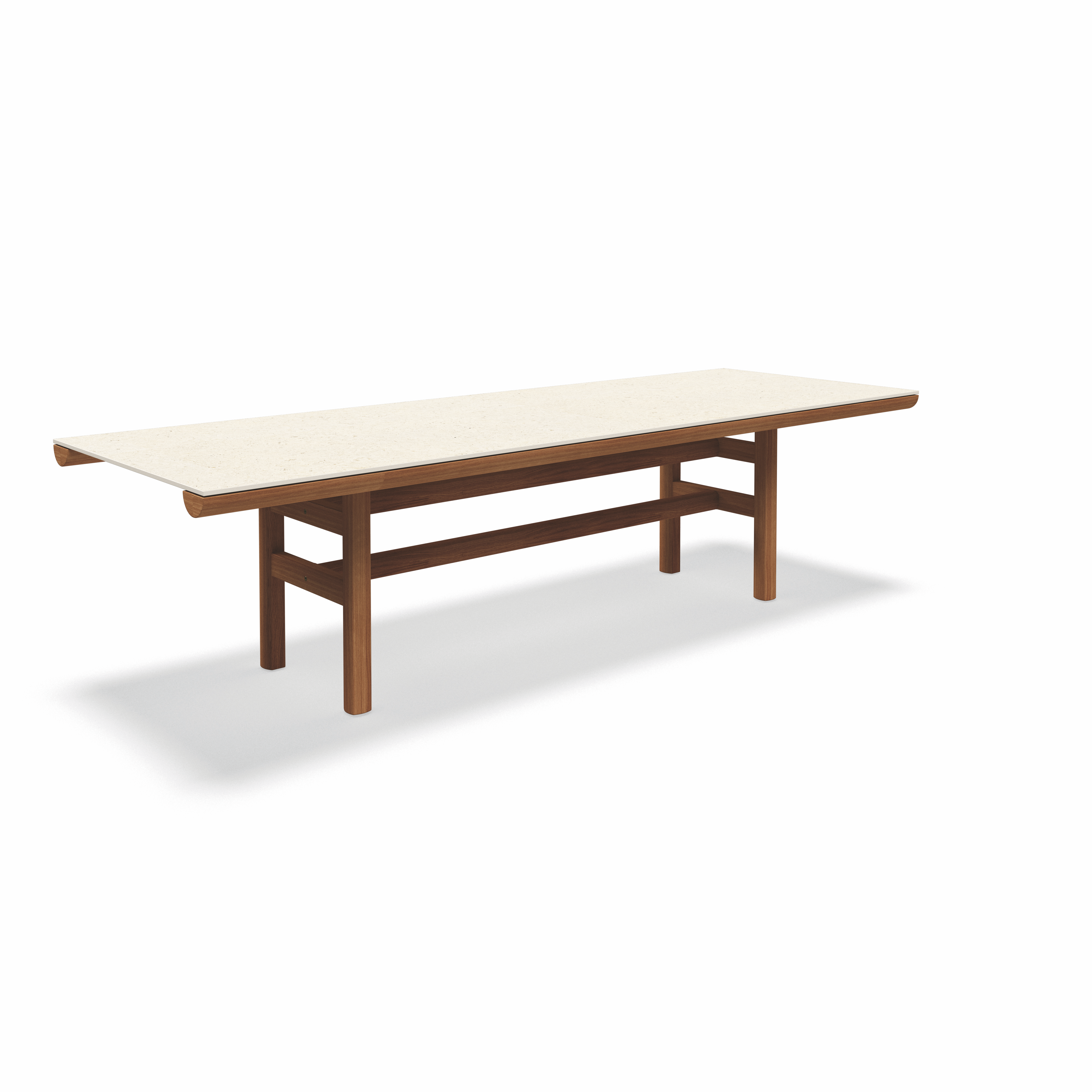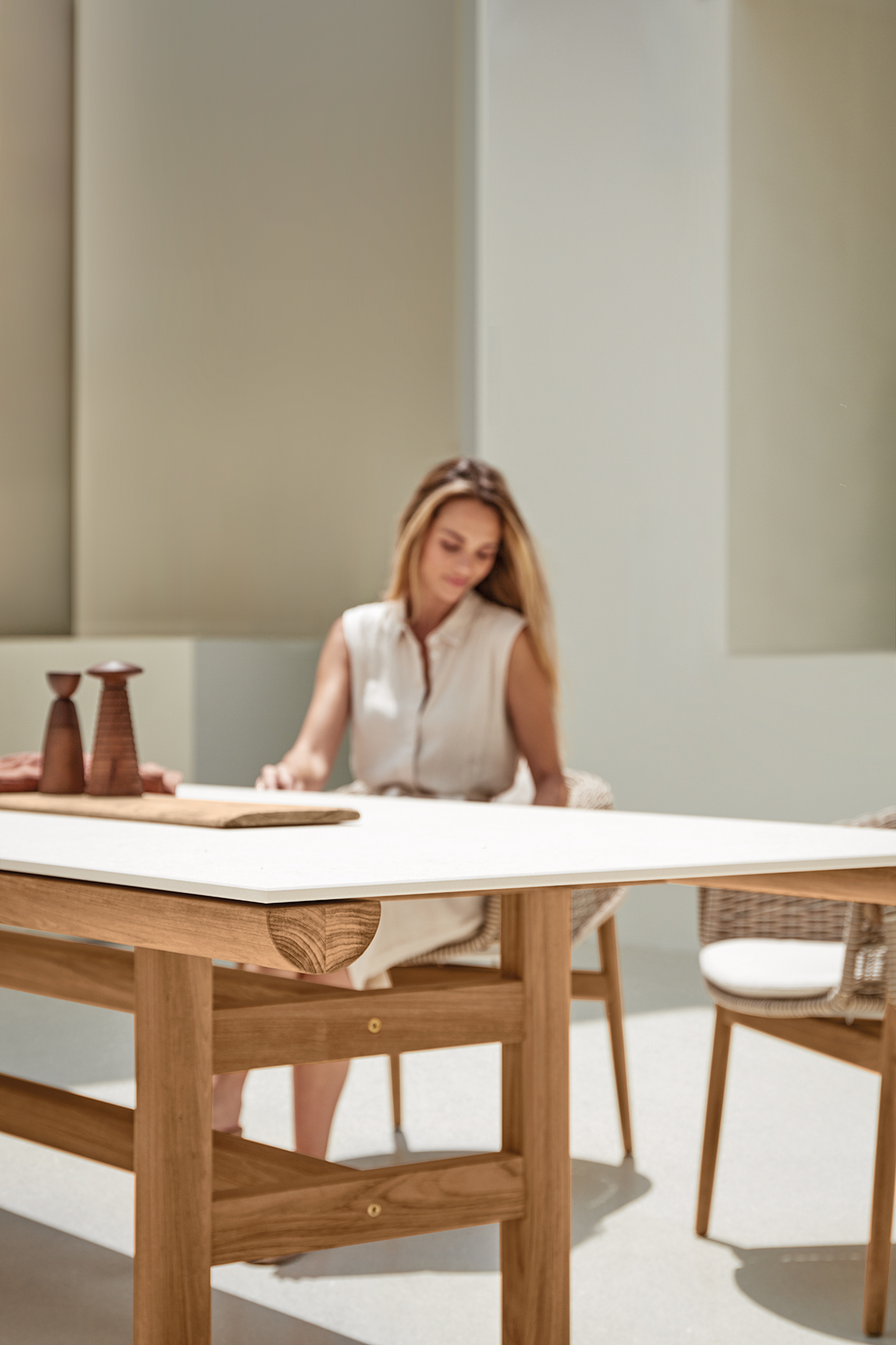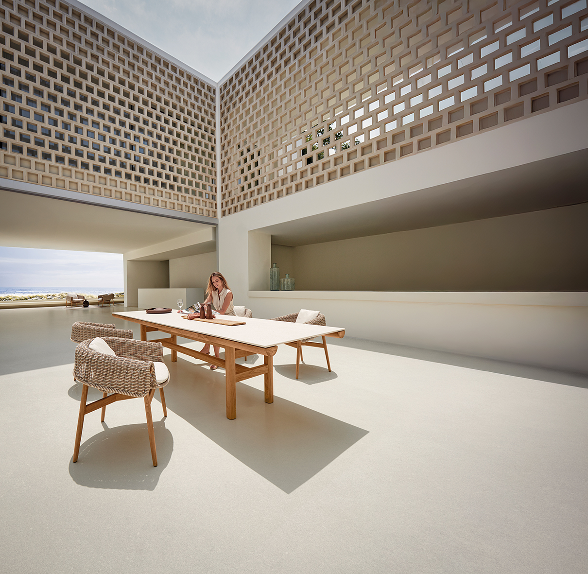 Die Rail Kollektion von Gloster steht für ruhige, präzise Outdoor-Architektur: Ein Rahmen aus naturbelassenem Teak trägt eine einteilige Keramik-Tischplatte und wirkt dabei bewusst reduziert, stabil und zeitlos. Rail ist als großzügiger Esstisch konzipiert – ein klarer Mittelpunkt für Terrasse, Garten und anspruchsvolle Hospitality-Settings.