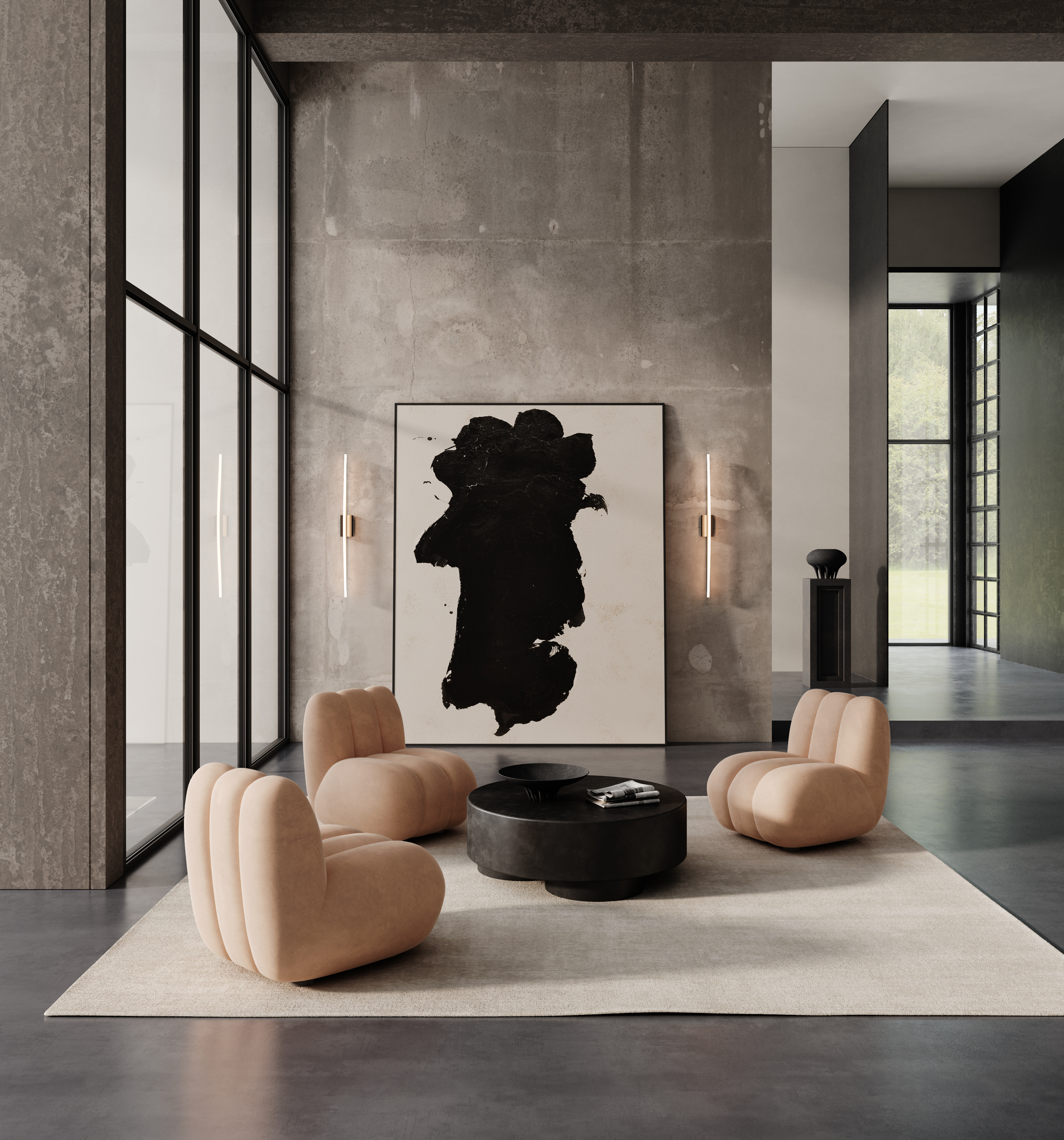 Gefertigt aus leichtem Fiber Concrete, kombiniert der Tisch architektonische Präsenz mit überraschender Leichtigkeit. Die handbemalte, strukturierte Oberfläche in Bone White oder Coffee verleiht jedem Stück eine einzigartige Tiefe und Haptik.