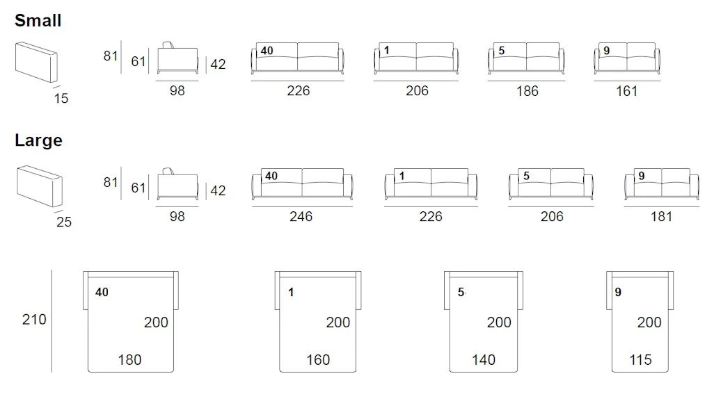 186 x 98 x 61/81 cm 206 x 98 x 61/81 cm 226 x 98 x 61/81 cm | 161 x 210 x 61 cm 186 x 210 x 61 cm 206 x 210 x 61 cm 226 x 210 x 61 cm |