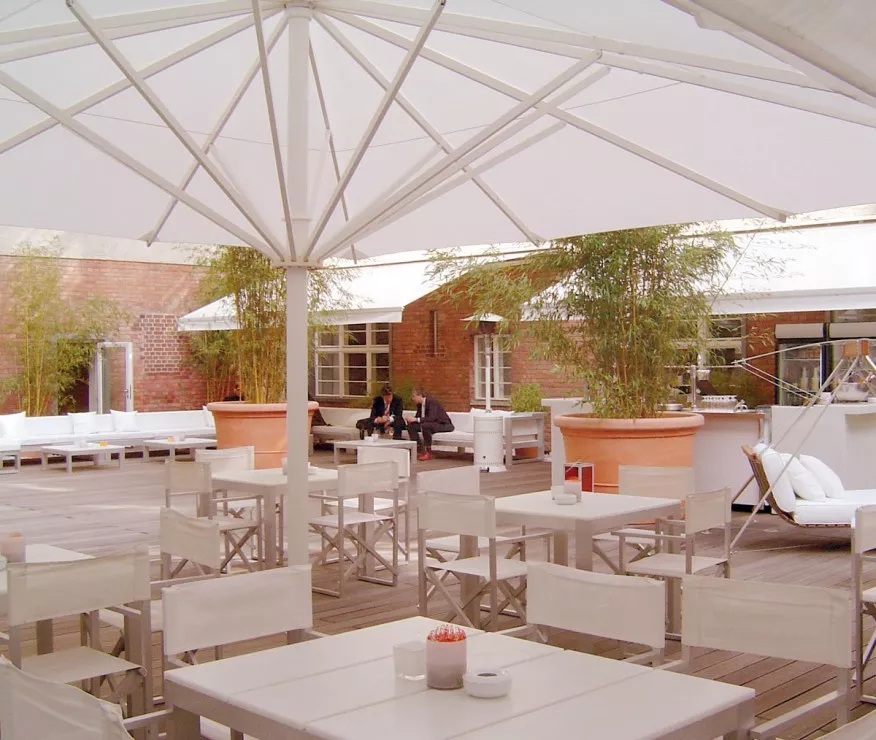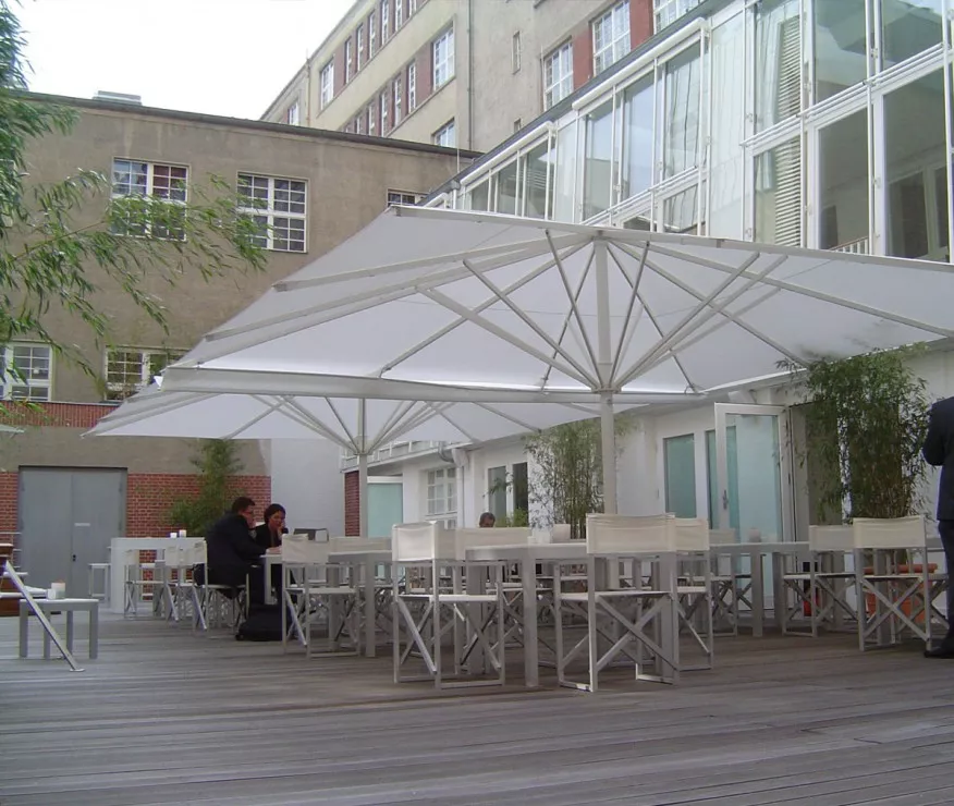 Speziell auf die Außengastronomie zugeschnitten, bietet dieses Schirmkonzept exklusive Atmosphäre auf großer Fläche.