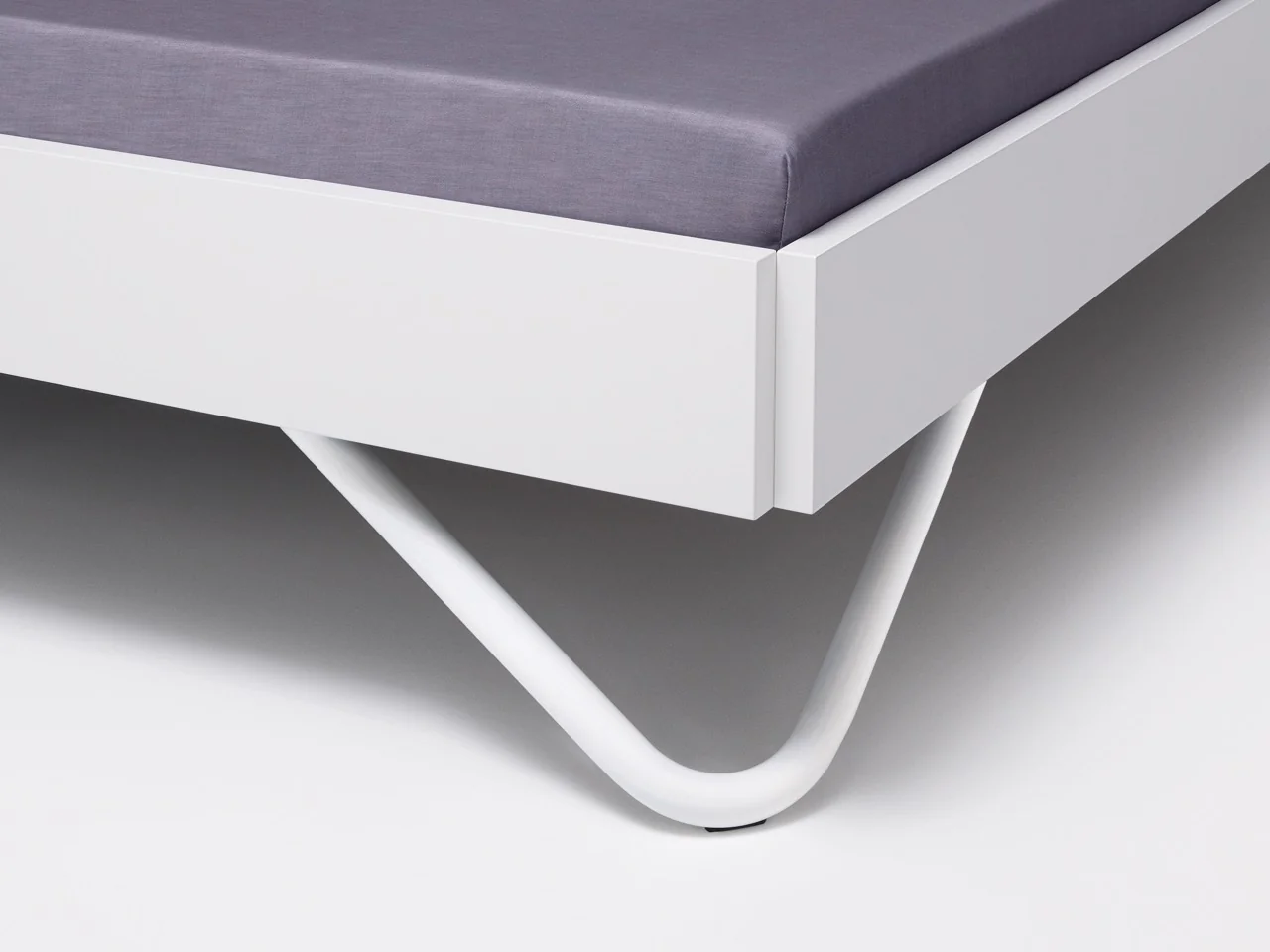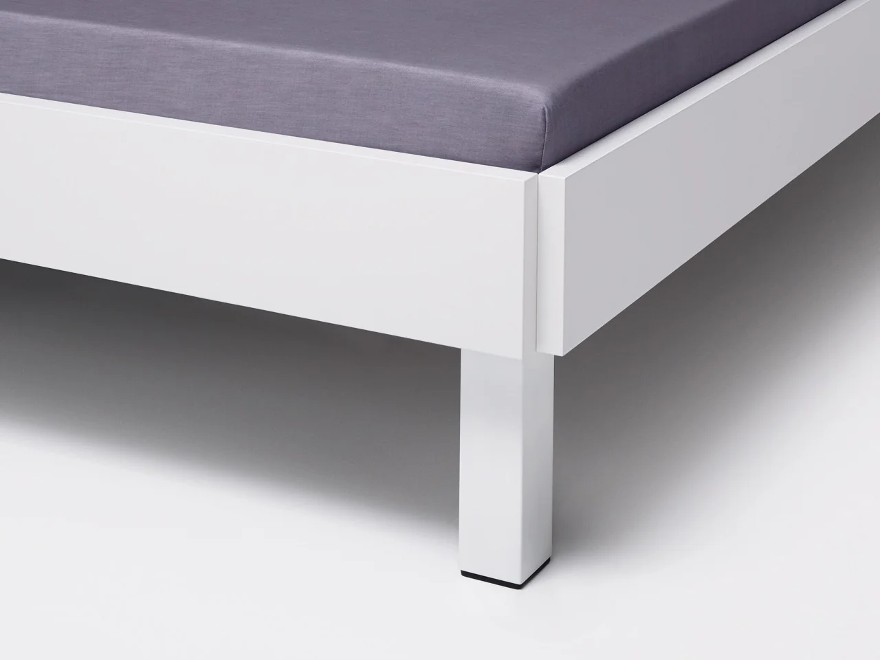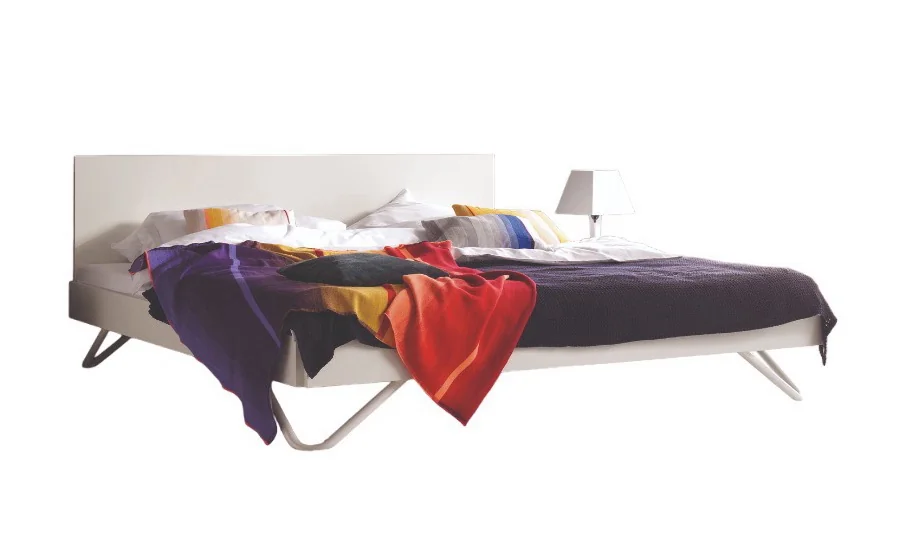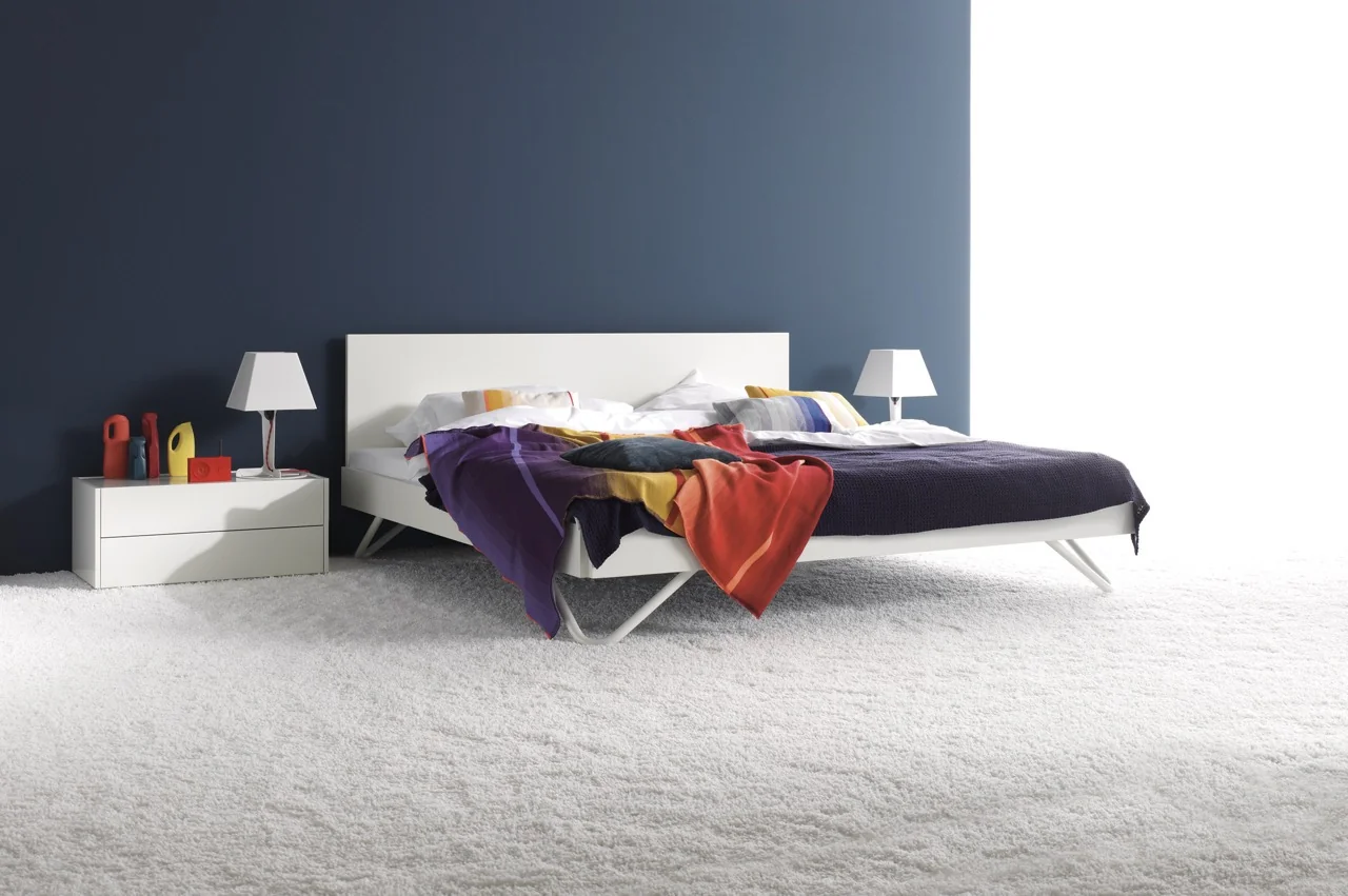 Das interlübke algo Bett bietet Flexibilität durch zwei Längen, sieben Breiten, zwei Kopfteilhöhen und verschiedene Fußvarianten. Die lackierte Rückseite ermöglicht eine freie Platzierung im Raum. Der 14,5 cm hohe Bettrahmen wirkt leicht und eignet sich gut für kleine Räume. Standardmäßig ist das Bett mit gebogenen Füßen ausgestattet, es gibt aber auch eckige Füße. Mit einem zusätzlichen Seitenteil ist es auch für Jugendzimmer geeignet.