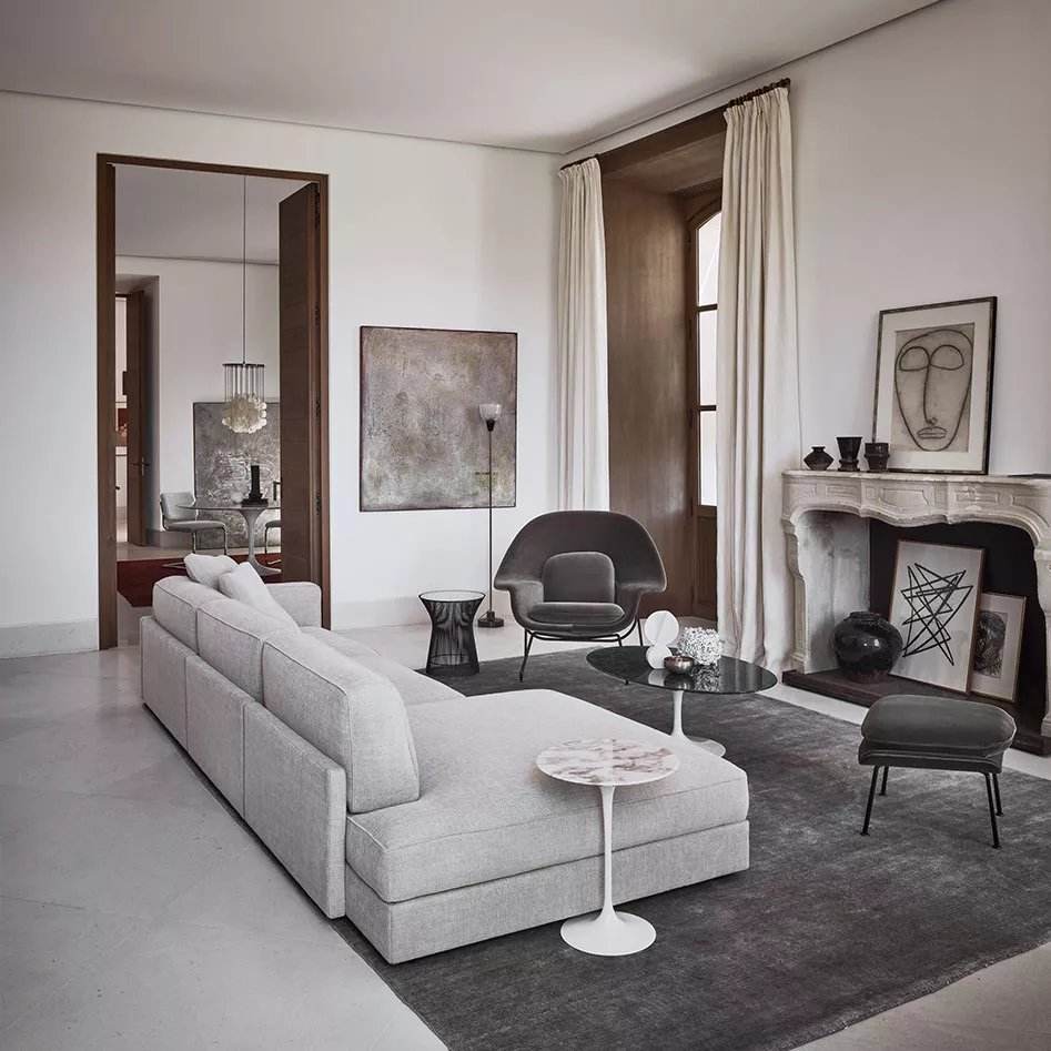 Knoll International • Saarinen Womb HockerNachdem er 1941 gemeinsam mit Charles Eames den Organic Design Wettbewerb des Museum of Modern Art mit ihren Experimenten mit gebogenem Sperrholz gewonnen hatte, war Eero Saarinen bestrebt, die Möglichkeiten eines Stuhls weiter zu erkunden, der Bequemlichkeit durch die Form seiner Schale erreichte und nicht durch die Tiefe seiner Polsterung. Zunächst begann er seine Untersuchungen mit Entwürfen für kleinere Fiberglas-Bürostühle, änderte jedoch seine Richtung, als Florence Knoll an ihn herantrat und fragte: "Warum nicht den Stier bei den Hörnern packen und zuerst den Großen machen? Ich möchte einen Stuhl, der wie ein Korb voller Kissen ist... etwas, in das ich mich einkuscheln kann." Obwohl Saarinen genau dort nicht landete, inspirierte der Vorschlag einen der ikonischsten und bequemsten Stühle der modernen Möbelbewegung. Wie viele von Saarinens Möbeldesigns erforderte auch der Womb Chair Produktionsmethoden und Materialien, die sich noch in den Kinderschuhen befanden. Saarinen und Florence Knoll fanden einen Bootsbauer in New Jersey, der mit Fiberglas und Harz experimentierte, um bei der Entwicklung von Herstellungsmethoden für den neuen Stuhl zu helfen. Florence Knoll: "Er war sehr skeptisch. Wir haben ihn einfach angefleht. Ich denke, wir waren so jung und so begeistert, dass er schließlich nachgab und mit uns zusammenarbeitete. Wir hatten viele Probleme und Misserfolge, bis sie schließlich einen Stuhl hatten, der funktionierte."Gestell: Stahlrohr, hochglänzend verchromt oder schwarz lackiert. Womb Hocker: Gepolstert mit Schaum über eine geformte Sperrholzunterlage Kissen: Polyurethan-Kern Polyesterfaster-FüllungGleitfüße: Edelstahl mit beweglichen Nylon-Gleitfüßen Hinweis: Das Logo "Knoll" ist in das Gestell des Stuhls und des Hockers eingeprägt.Weitere Stoffe sind auf Anfrage erhältlich. Maße: Breite 64cm x Tiefe 51,5cm x Höhe 40cm Bitte beachten Sie, dass die angezeigten Bilder Illustrationszwecken dienen und von dem tatsächlichen Endprodukt abweichen können.