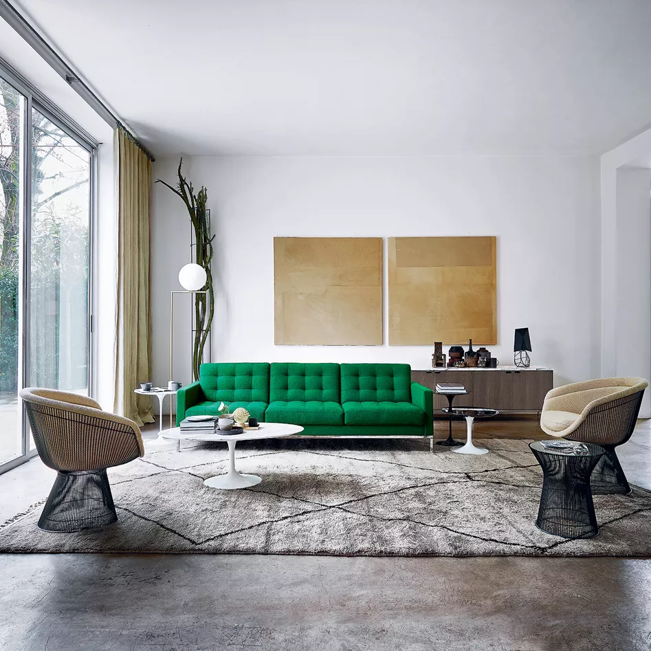 Knoll International • Bertoia Stuhl Zur Feier des 100. Geburtstags des Designers wird auf der Salone del Mobile 2015 der klassische Side Chair in einer neuen Version präsentiert, mit einer verchromten Stahlrohrstruktur und einem Sitz aus Polypropylen in verschiedenen Farben, in einer speziellen "Jubiläumsausgabe". Eine moderne, farbenfrohe Interpretation einer unverwechselbaren Schöpfung, die ihr einzigartiges, lineares Design getreu nachbildet. Der neue Stuhl zeichnet sich durch seinen äußerst bequemen Sitz und seine Anpassungsfähigkeit an eine breite Palette von Kontexten aus, vom privaten Wohnbereich bis hin zu gewerblichen Räumen. Der Hocker ist ebenfalls in dieser neuen Version erhältlich. Im Jahr 1950 boten Hans und Florence Knoll dem Bildhauer Harry Bertoia die Möglichkeit, seine künstlerischen Konzepte frei bei der Schaffung eines Stuhls in ihre Sammlung einzubringen, die sich noch in ihrer Anfangsphase befand. "Wir beschlossen, ihn in vollkommener Freiheit arbeiten zu lassen, um die Kreativität nicht zu behindern, die ihn bereits zu dieser Zeit im Panorama der Designer auszeichnete", erinnerte sich Florence Knoll. Bertoia, ständig auf der Suche nach Perfektion, arbeitete von Hand und erprobte viele Variationen, mit dem Ziel, den Raum zu gestalten und dabei eine leichte, luftige Struktur zu nutzen. Dank eines nahezu künstlerischen Verfahrens wurden verschiedene Sitzgelegenheiten geschaffen, von der Side Chair und dem Hocker für den Essbereich bis zu den Diamond und Large Diamond Sesseln, bis hin zum Lounge-Modell, dem Bird Chair, und dem Asymmetrischen Modell. Jeder hatte seine eigene natürliche und skulpturale Form. Die Bertoia-Kollektion (1952) ist nach wie vor in einer breiten Palette von Bezügen erhältlich, die perfekt zu den innovativen Möbeln passen, die Harry Bertoia mit solchem Geschick und künstlerischer Intelligenz entworfen hat.Gestell und Korb: geschweißter Stahldraht, hochglänzend, satiniert verchromt, Bronze lackiert oder mit Beschichtung aus Rilsan, einer sehr haltbaren und aufgeschmolzenen Nylon-Tauchlackierung.Kratzfest, platzt nicht ab und chemikalienecht.Verbindungen aus Edelstahl. Gleiter: Schwarze Kunststoffgleiter am Stuhl. Hinweis: Das Logo "Knoll" ist in das Stuhlgestell eingeprägt.Der Stuhl besitzt keine Polsterung, kein integriertes Sitzkissen und keine Sitzschale aus Kunststoff. Sitzkissen optional wählbar. Weitere Stoffe sind auf Anfrage erhältlich. Maße: Höhe 73cm x Breite 54cm x Tiefe 58cm