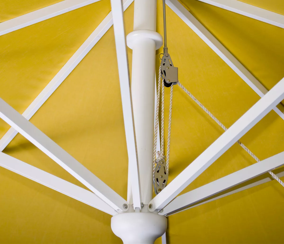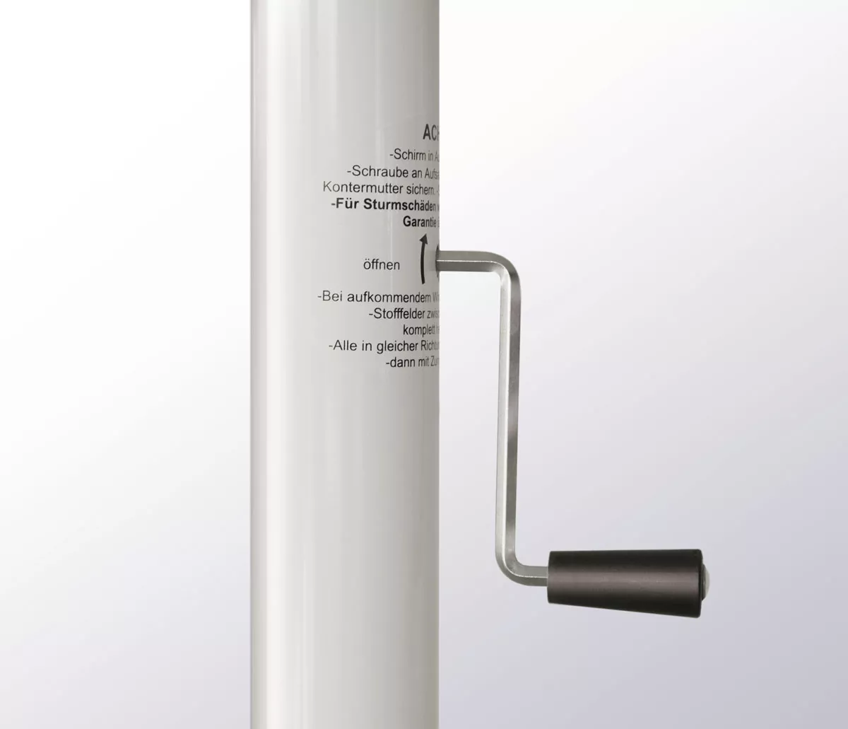 Der Großschirm wird mit einem Kurbelantrieb geöffnet und geschlossen.