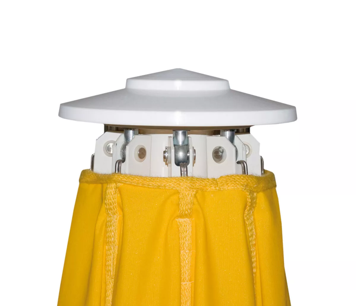 Verteilerscheiben mit Stützstreben und Speichen. Um ein Verdrehen der Speichen zu verhindern, ist die untere Verteilerscheibe fest mit dem Schirmmast verschweißt.
