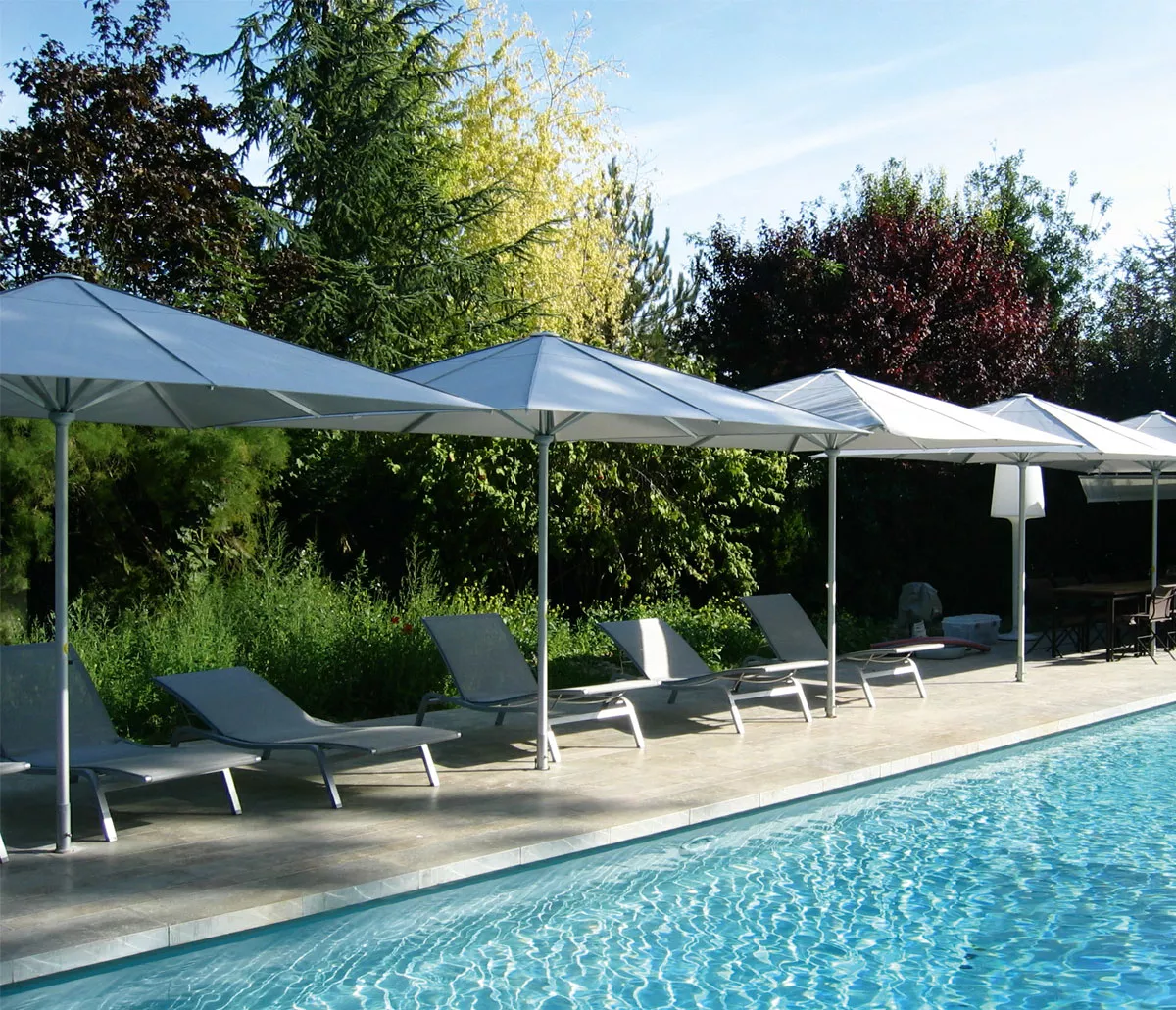 Bei Tests im Windkanal konnten wir die Stabilität und hohe Standfestigkeit unserer Schirme unter Beweis stellen. So konnten selbst Windgeschwindigkeiten von 50 km/h einem Schirm mit Ø 5 m nichts anhaben. Wichtig ist, dass der Standrahmen je nach Windanfälligkeit des Aufstellungsortes entsprechend beschwert wird.