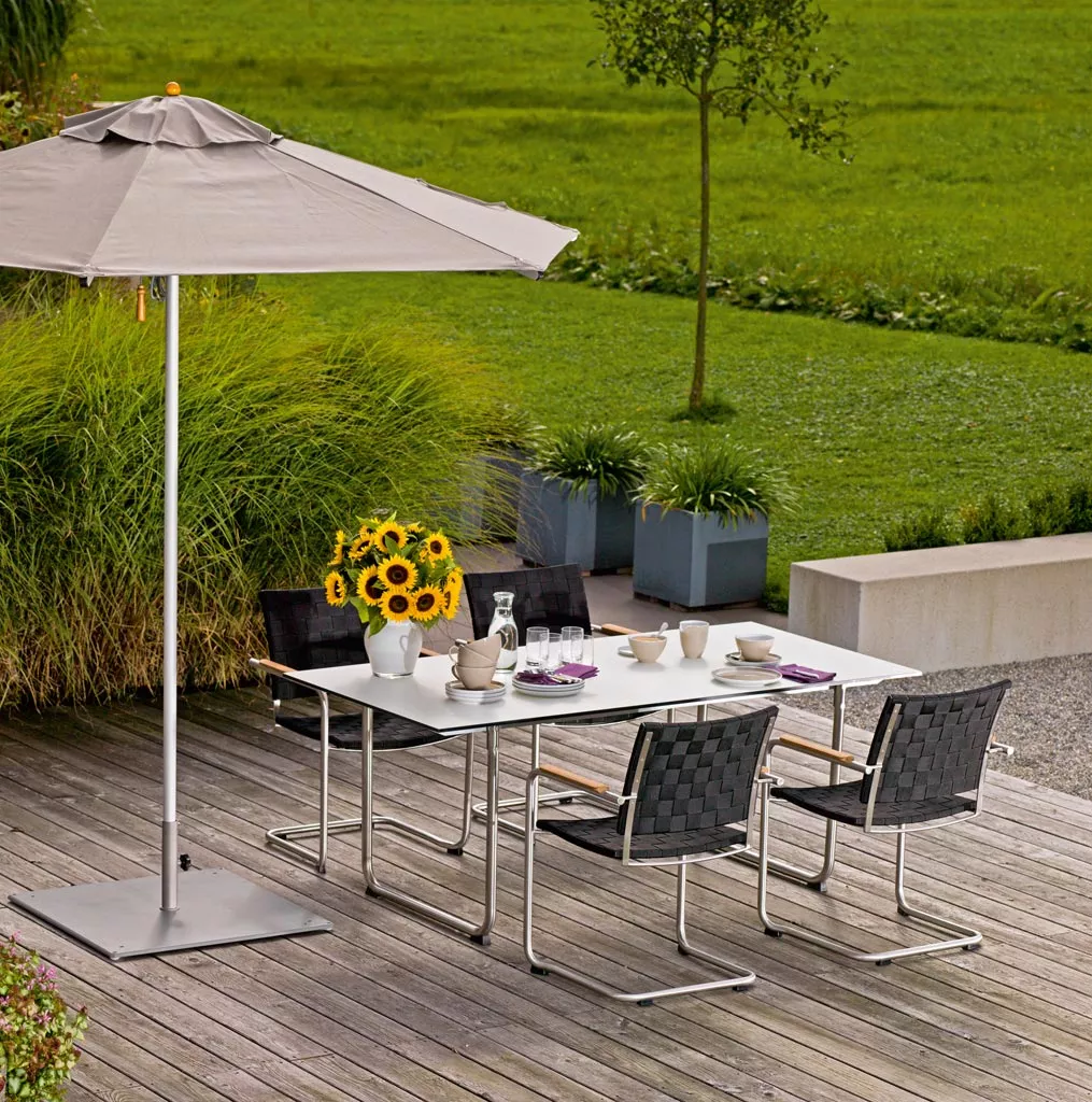 Klassisch-traditionell oder modern und design-orientiert - ganz gleich, in welchem Ambiente Sie sich zu Hause fühlen: Dieser Aluschirm von Weishäupl macht immer eine gute Figur. Dank der Verwendung unterschiedlicher Materialien fügt er sich harmonisch in jede Umgebung ein. Mast und Streben sind aus hochwertigem Aluminium gefertigt und hellgrau eloxiert. Die Schirmnaben hingegen bestehen aus verleimtem Hartholz. Ein Material-Mix, der nicht nur optisch überzeugt, sondern auch funktionale Vorteile bietet: Zum einen Stabilität und zum anderen erhöhte Witterungsbeständigkeit des Gestells. Die Bespannungen bestehen aus Acryltuch (100% Acrylgewebe) und werden generell mit einer sogenannten Lufthaube gefertigt. Diese Gewebe sind wasserabweisend und fäulnishemmend imprägniert.