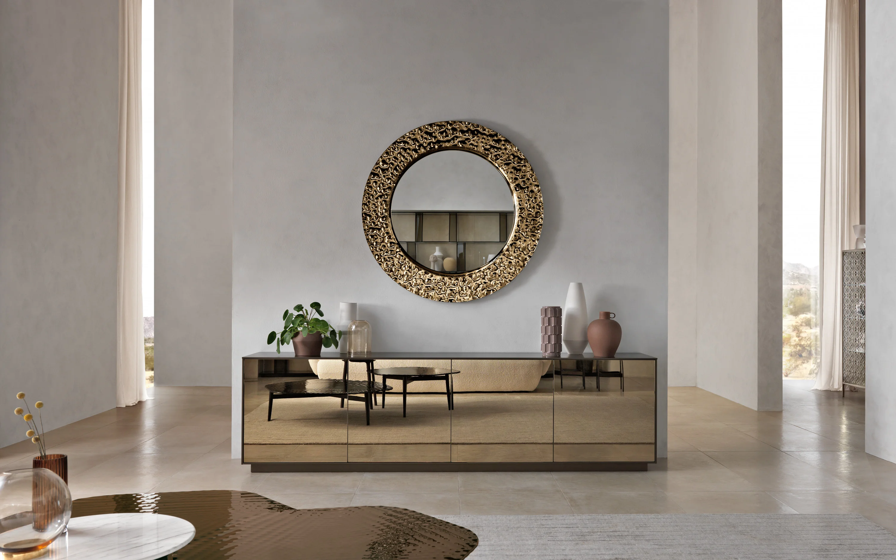 FIAM CHRISTINE Wandspiegel Eleganter Wandspiegel CHRISTINE aus geschmolzenem Glas Design von Helidon Xhixha & Dante O. Benini-Luca Gonzo Versilberte, geschmolzene Spiegelfläche mit 6 mm flacher Ausführung. Der rückseitige Rahmen aus lackiertem Metall sorgt für Stabilität und eine hochwertige Optik. Flexibel einsetzbar – sowohl vertikal als auch horizontal aufhängbar.Die Schmiedenspuren sind ein eigentuemliches und unverwechselbares Merkmal des Artikels und garantieren die handwerkliche Kunstfertigkeit vom Objekt.Bitte beachten Sie: Die Ausführungen in Rauch- oder Bronzeglas beziehen sich ausschließlich auf den Rahmen – die Spiegelfläche bleibt klar versilbert. Für weitere Informationen und weitere Varianten der Spiegelfläche steht Ihnen unser Kundenservice gerne zur Verfügung.Netto-Gewicht: 28 kg bis 48 kg Gegen Aufpreis erhältlich in Rauchglas und Bronzeglas