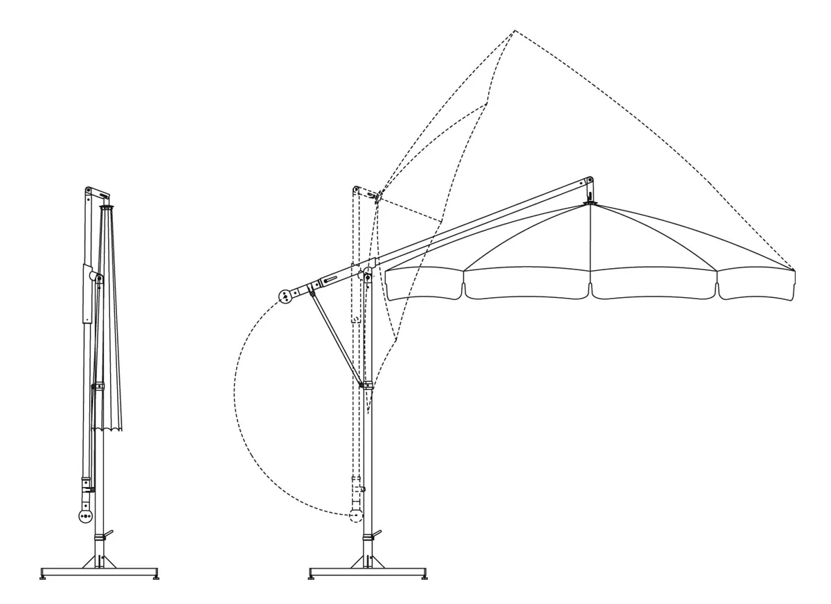 - Das Schirmdach ist um 90° um die Gelenkachse drehbar