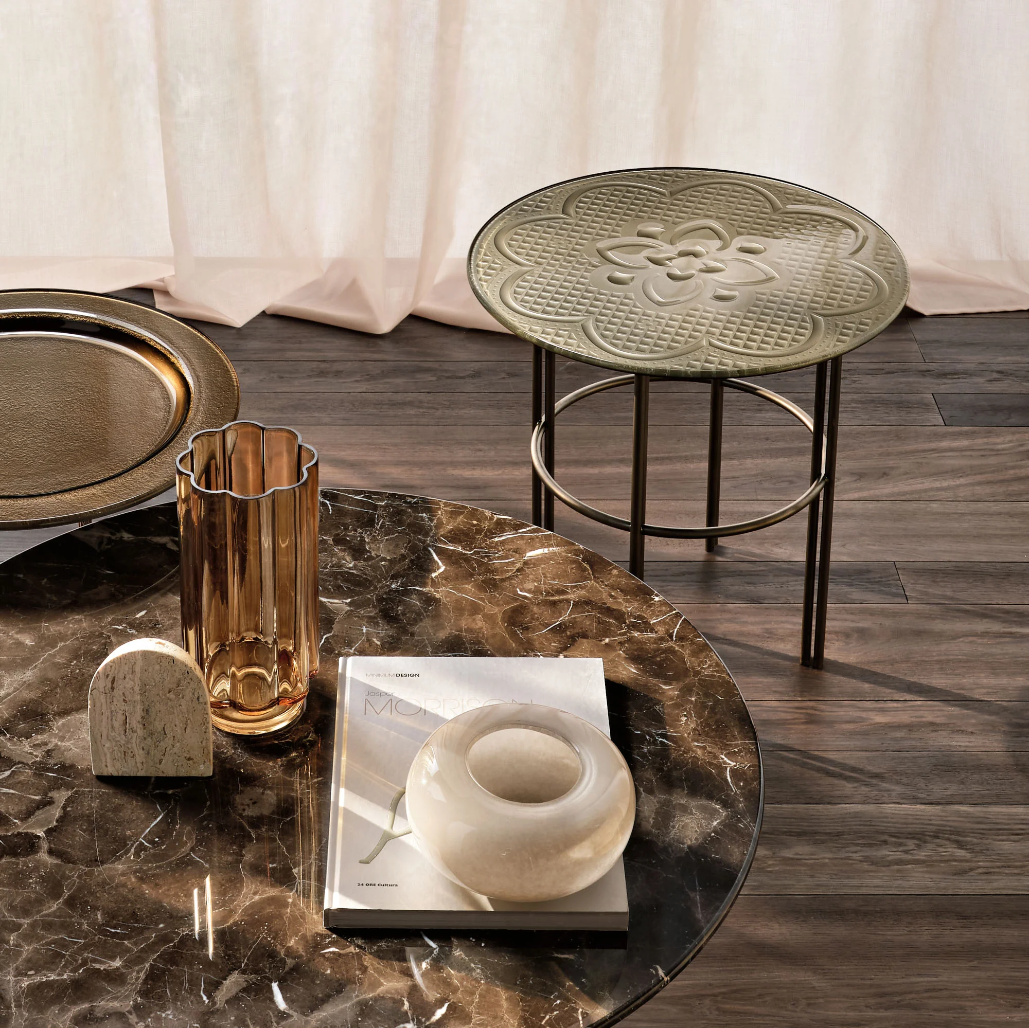 FIAM HALO Couchtisch • verschiedene Größen HALO Couchtisch – Design von FRANCESCA LANZAVECCHIAHALO Couchtisch von FIAM – modernes Design mit Charakter. Der HALO Couchtisch von FIAM überzeugt durch klare Linien, hochwertige Materialien und eine besondere Verarbeitung. Die 10 mm starke Tischplatte aus geschmolzenem und gehärtetem Glas ist in den Varianten Rauchglas oder Bronzeglas erhältlich. Alternativ ist HALO auch mit einer edlen Marmorplatte verfügbar – für einen besonders exklusiven Look. Das Untergestell aus Metall mit einer brunierten Messingoberfläche sorgt für Stabilität und verleiht dem Tisch einen eleganten, warmen Akzent. Ob in modernem Ambiente oder als stilvoller Kontrast zu klassischen Elementen – HALO passt sich flexibel an und wird zum Blickfang in jedem Wohnraum. Tragfähigkeit der Glasplatte: 30 kg
