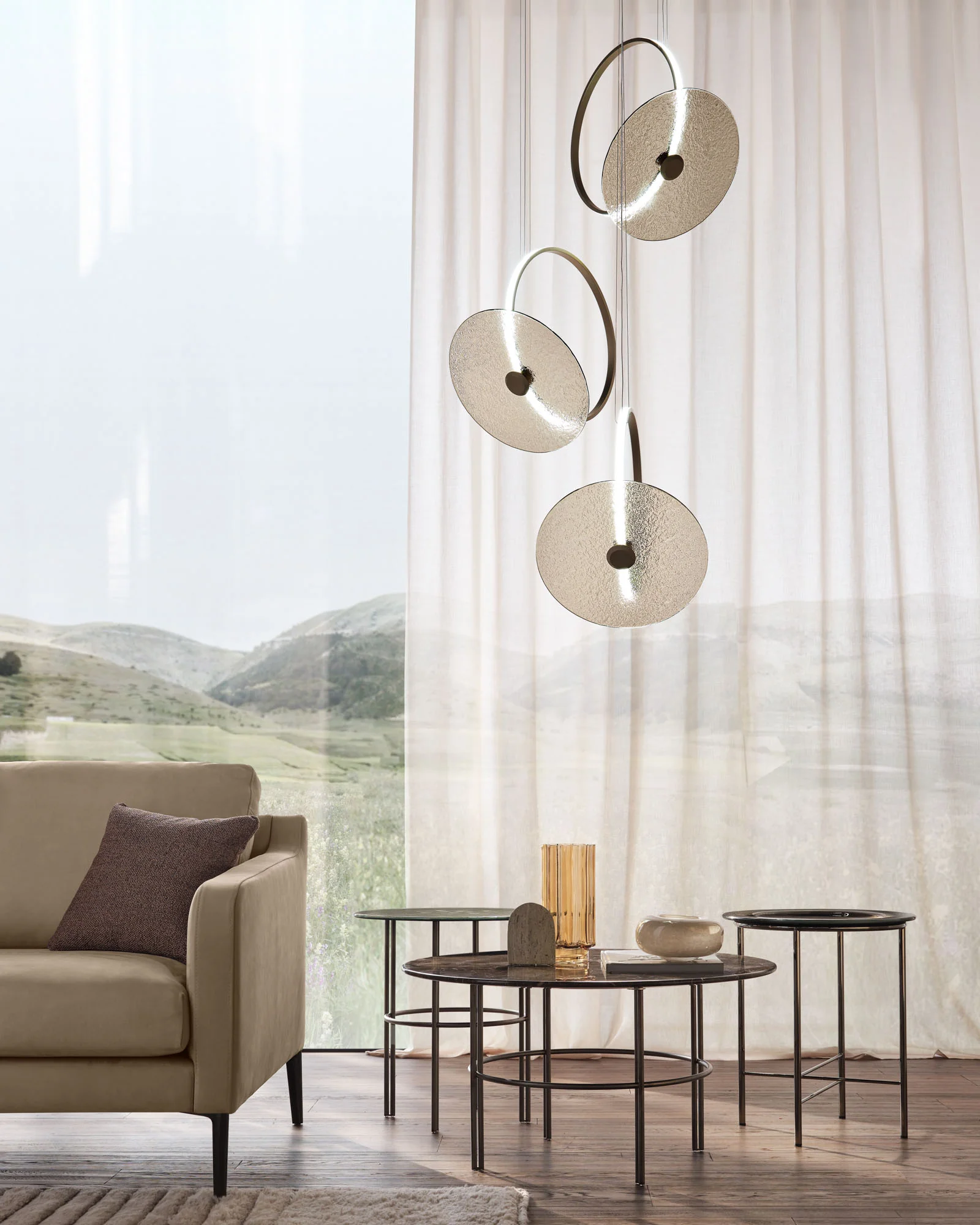 FIAM PEARL Hängeleuchte • Kompositionen aus 3 Elementen PEARL Hängeleuchte – Design von ADELE MARTELLIDie Hängeleuchte Pearl aus dem Hause FIAM vereint zeitloses Design mit edlen Materialien und feinster Handwerkskunst. Ihr filigraner Rahmen aus Metall in eleganter brunierter Messingausführung verleiht ihr eine warme, luxuriöse Ausstrahlung. Im Zentrum stehen zwei mundgeblasene Glaskugeln:Die äußere Kugel aus transparentem Murano-Glas (Ø 30 oder 40 cm) sorgt für eine schwebende LeichtigkeitDie innere Kugel aus weißem Opalglas (Ø 15 cm) dient als Diffusor und verteilt das Licht weich und gleichmäßig im RaumDie integrierte LED-Lichtquelle ist dezent in die Struktur eingearbeitet und sorgt für eine angenehme, energieeffiziente Beleuchtung. Ob als Einzelstück oder in Kombination – Pearl ist ein leuchtendes Designobjekt für stilvolle Innenräume.Leichte Spuren, Oberflächenunregelmäßigkeiten und kleine Luftblasen im Glase sind Merkmale des Blasprozesses, die die Handwerkliche Qualität garantieren. Sie können daher nicht beanstanden werden.