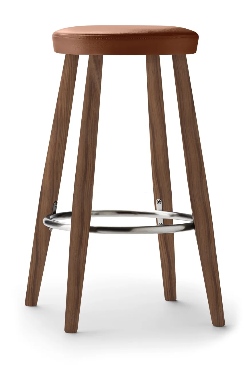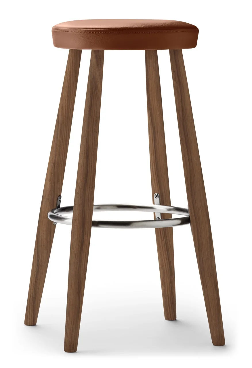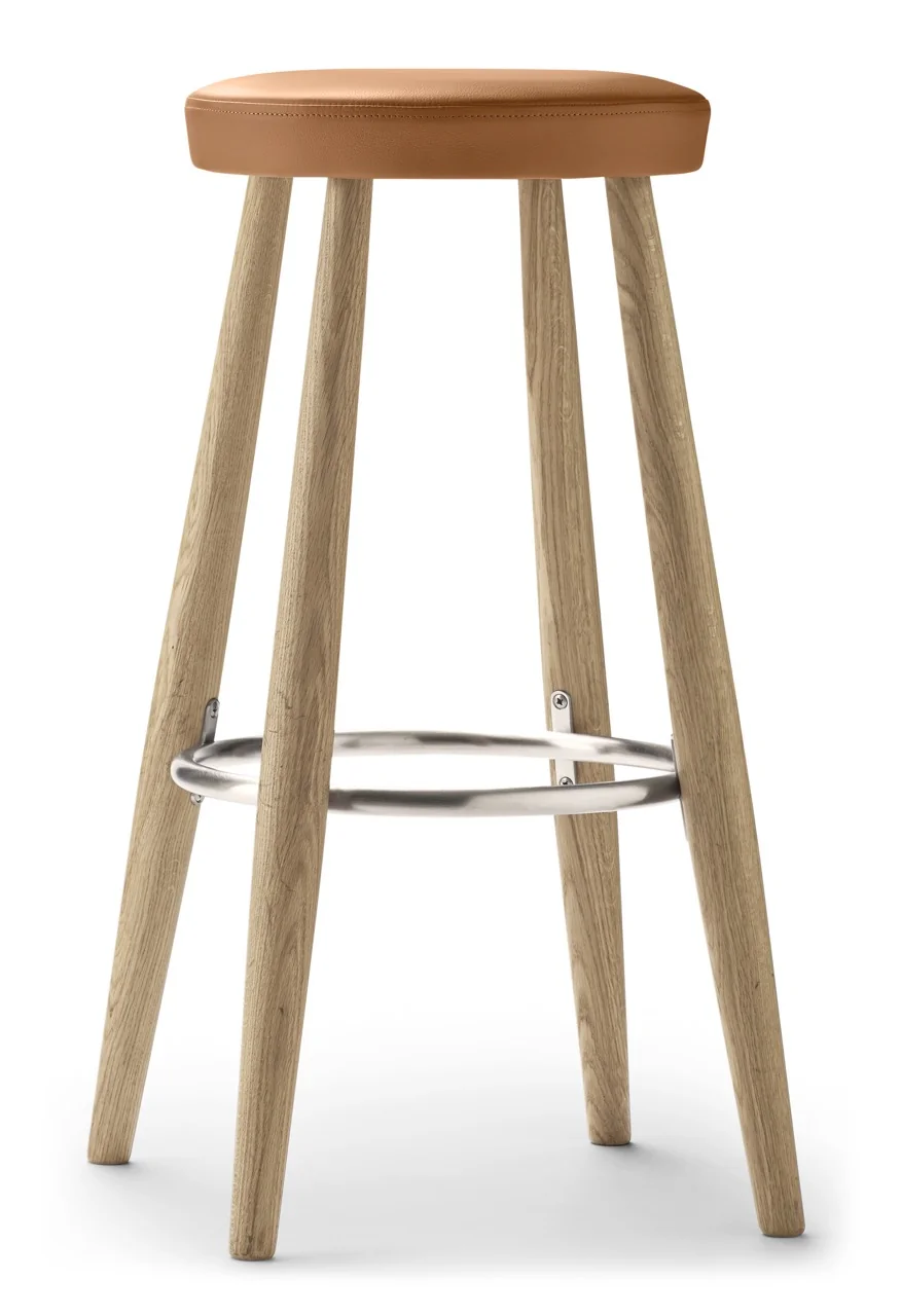 Carl Hansen CH56/CH58 Hocker Die Hocker CH56 und CH58 von Hans J. Wegner vereinen robuste Stabilität mit minimalistischer Eleganz. Beide Modelle verfügen über vier leicht geneigte Beine, die durch einen Edelstahlring verstärkt werden, der gleichzeitig als Fußstütze dient. Der CH56 ist ideal für die Barhöhe, während der etwas niedrigere CH58 perfekt an eine Küchenzeile passt.Materialien: Sitz gepolstert, wählbar aus verschiedenen LedergruppenFußstütze: EdelstahlMontage: Der Stuhl wird vollständig montiert geliefert und ist sofort einsatzbereitDesigner: Hans J. Wegner Gewicht: 5 kgMaße:CH56: H 76 x B 39 x T 35 cmCH58: H 68 x B 36 x T 35 cm