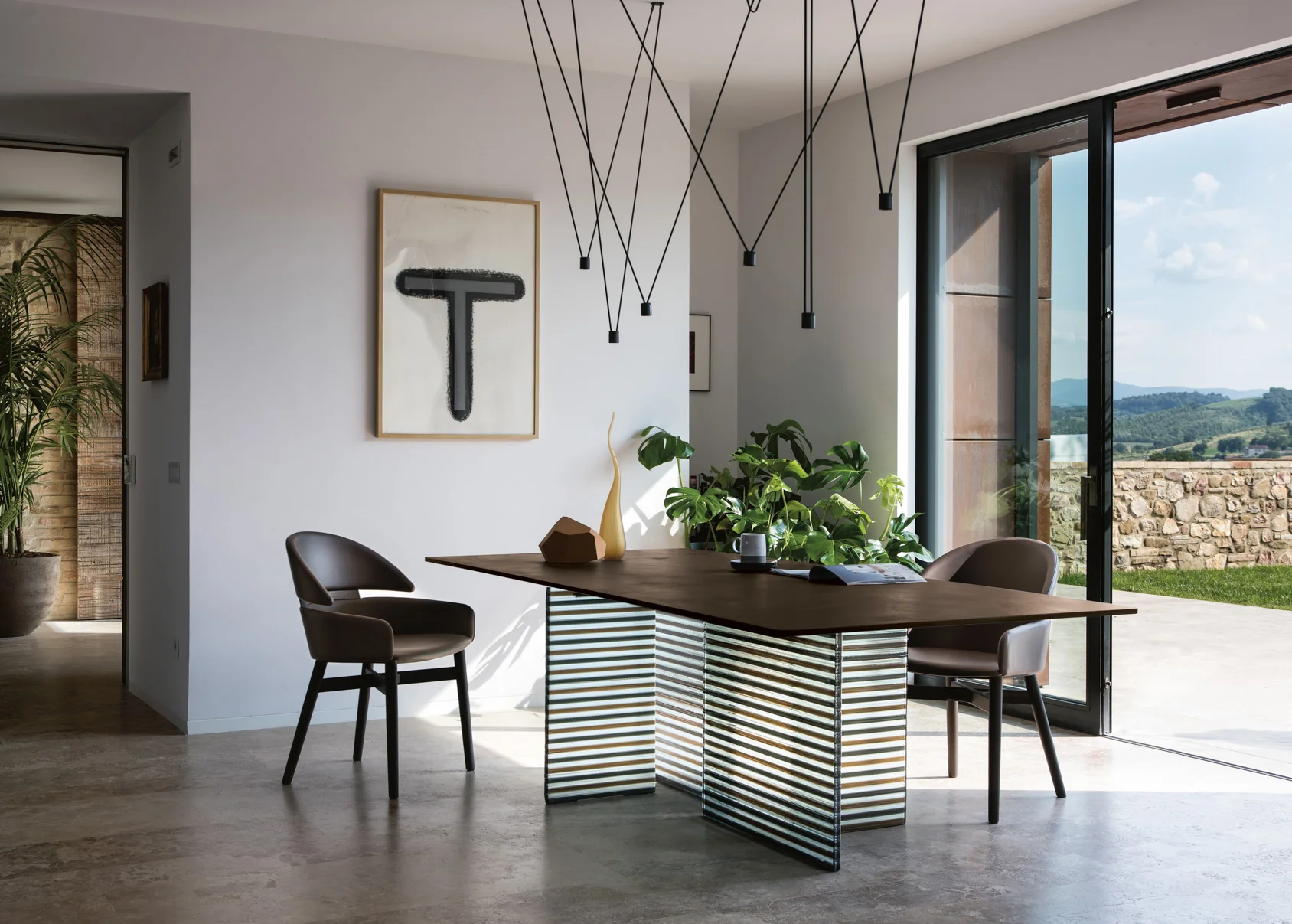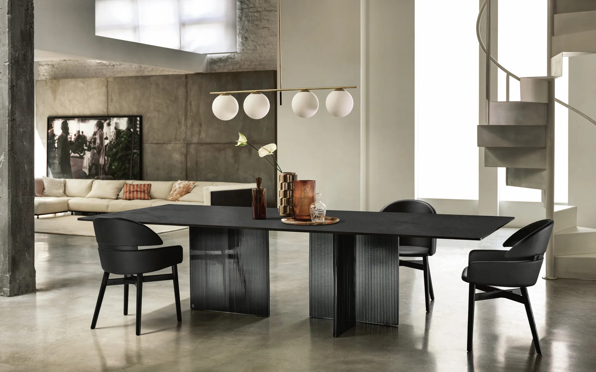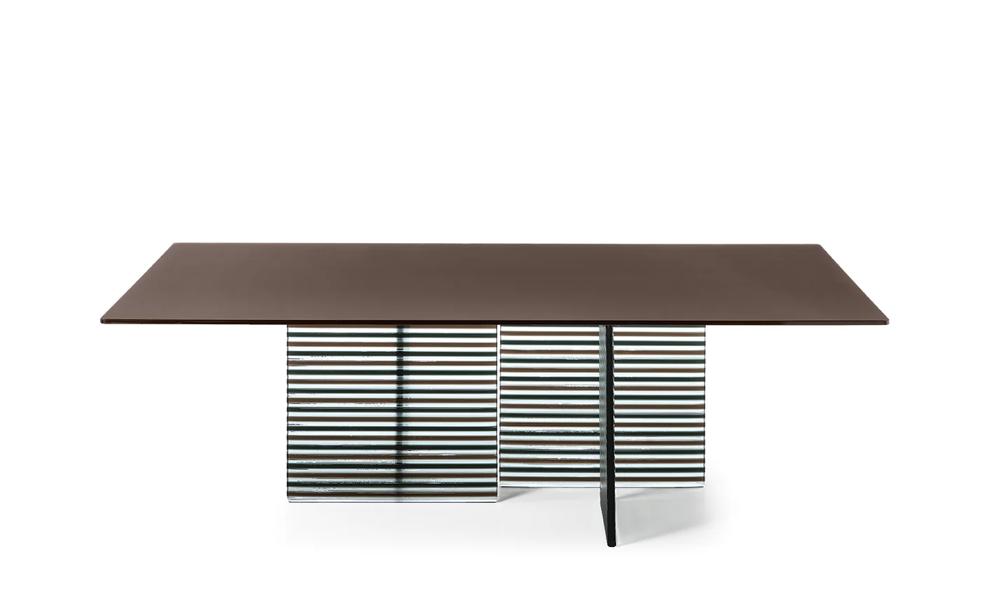 FIAM BIG WAVE Esstisch • verschiedene GrößenInteressieren Sie sich für den Tisch in einer anderen Ausführung? Unser Kundenservice hilft Ihnen gerne weiter und berät Sie persönlich – wir freuen uns auf Ihre Anfrage! BIG WAVE von FIAM - Design LUDOVICA + ROBERTO PALOMBAEin Statement aus Glas, Handwerk und Design. Der BIG WAVE Tisch beeindruckt durch seine außergewöhnliche Basis, die aus vier oder sechs skulpturalen Elementen aus 30 mm starkem, hochwertigem DV-Glas gefertigt ist – veredelt mit farbigen Akzenten (Streifen), die jede Perspektive lebendig wirken lassen.Die Tischplatte ist wahlweise in drei exklusiven Ausführungen erhältlich: Klares, gehärtetes Glas (15 mm) – auf der Unterseite monochrom lackiert für einen modernen, eleganten Look Handveredelte Oberfläche mit Ecomalta – jeder Tisch ein Unikat mit fein strukturierter Haptik Edles Walnussfurnier (Canaletto) in Tabak-Finish – 40 mm stark, für ein warmes, luxuriöses Ambiente In der Konfiguration sind die folgenden Ausführungen erhältlich, für weitere Varianten, kontaktieren Sie gerne unseren Kundenservice: Platte aus Glas "Tabak" mit Ecomalta gespachtelt - Gestell DV Glas bronze- & transparente vertikale Streifen Platte aus Glas „Total Schwarz mit Ecomalta gespachtelt - Gestell DV Glas rauch- & transparente vertikale StreifenWeitere Informationen: Tragfähigkeit der Glasplatte: 150 kgTischhöhe: 75 cm Ein Meisterstück italienischen Designs – kraftvoll, kunstvoll und absolut einzigartig.