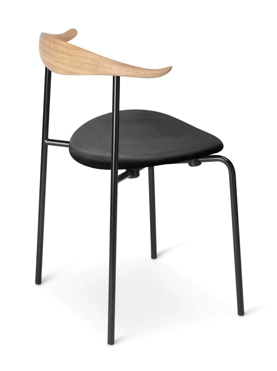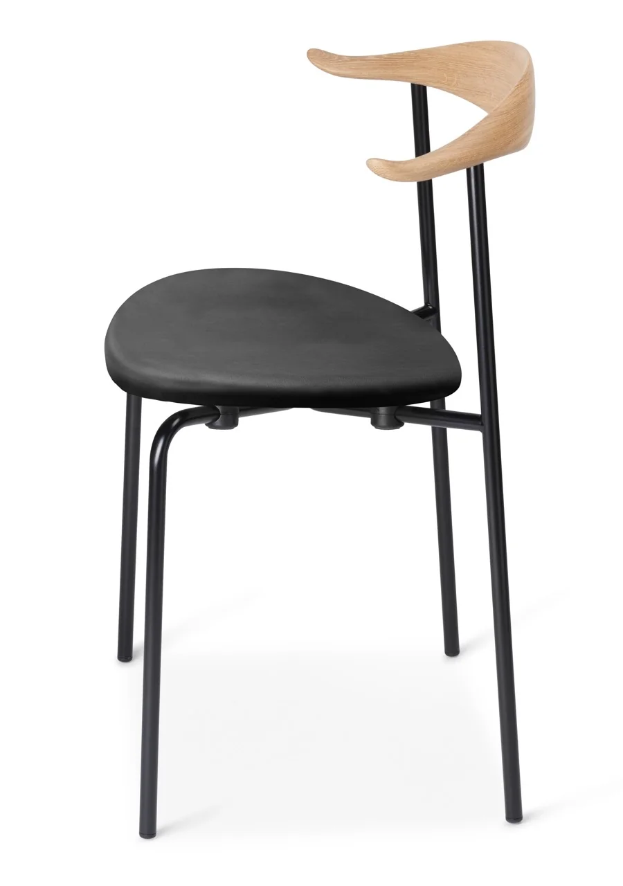 - Materialien: Gestell aus Stahl in Schwarz, Sitzfläche und Rückenlehne aus FSC™-zertifiziertem Eichen- oder Buchenholz, gepolsterte Sitzfläche in Leder