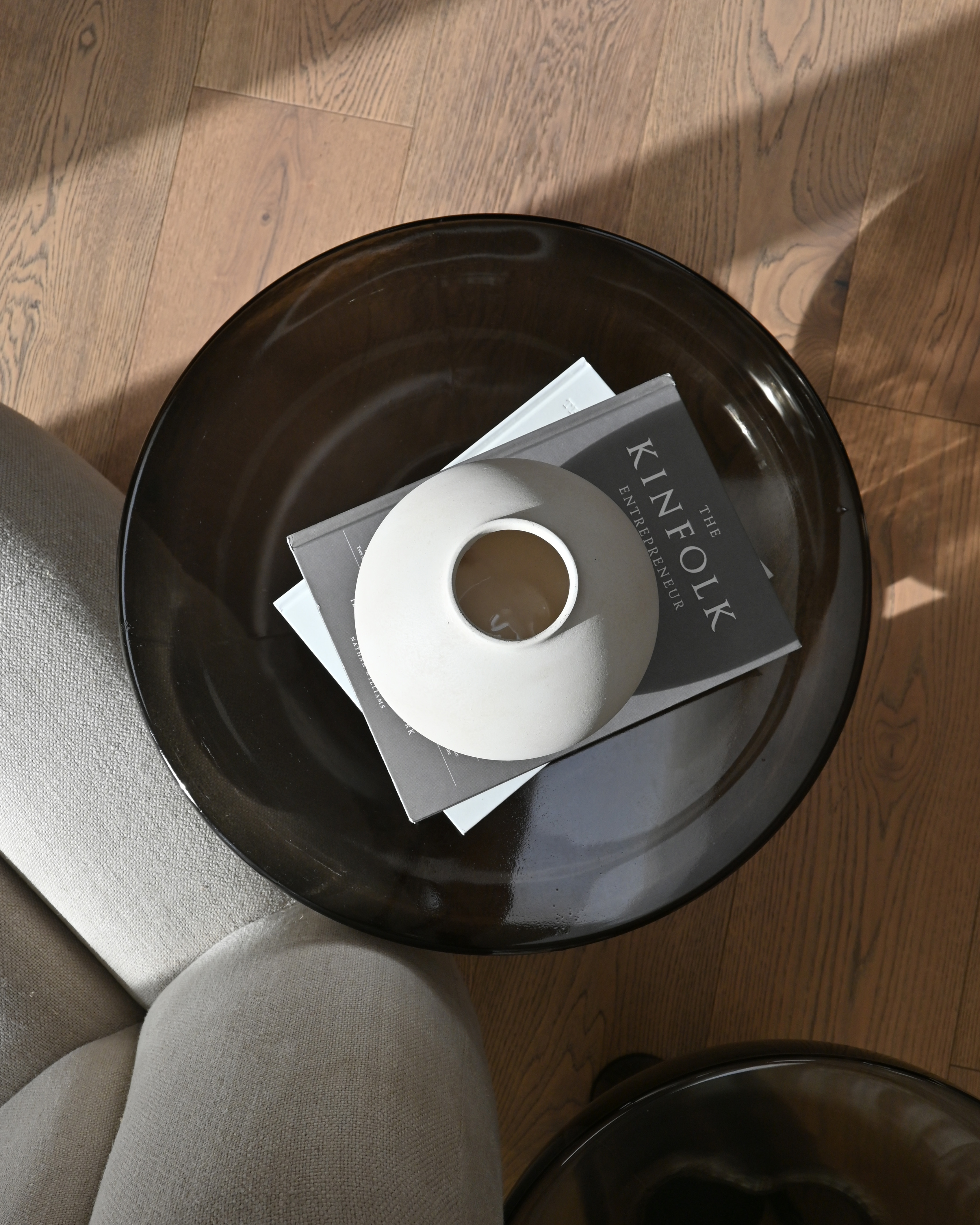 - Oberfläche: Smoked Desert & Smoked Forest – Mundgeblasenes Glas, Bone White & Coffee - Faserbeton und Burned Black - Aluminium, pulverbeschichtet