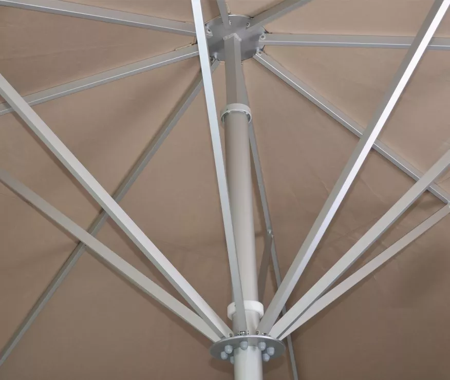 Der Großschirm wird mit einer leichtgängigen, abnehmbaren Edelstahl-Handkurbel oder Akku-Bohrmaschine (6-Kant-Einsatz) geöffnet und geschlossen. Ein präzise laufendes innenliegendes Kegelradgetriebe sorgt für mühelose Bedienung, auch nach vielen Jahren.