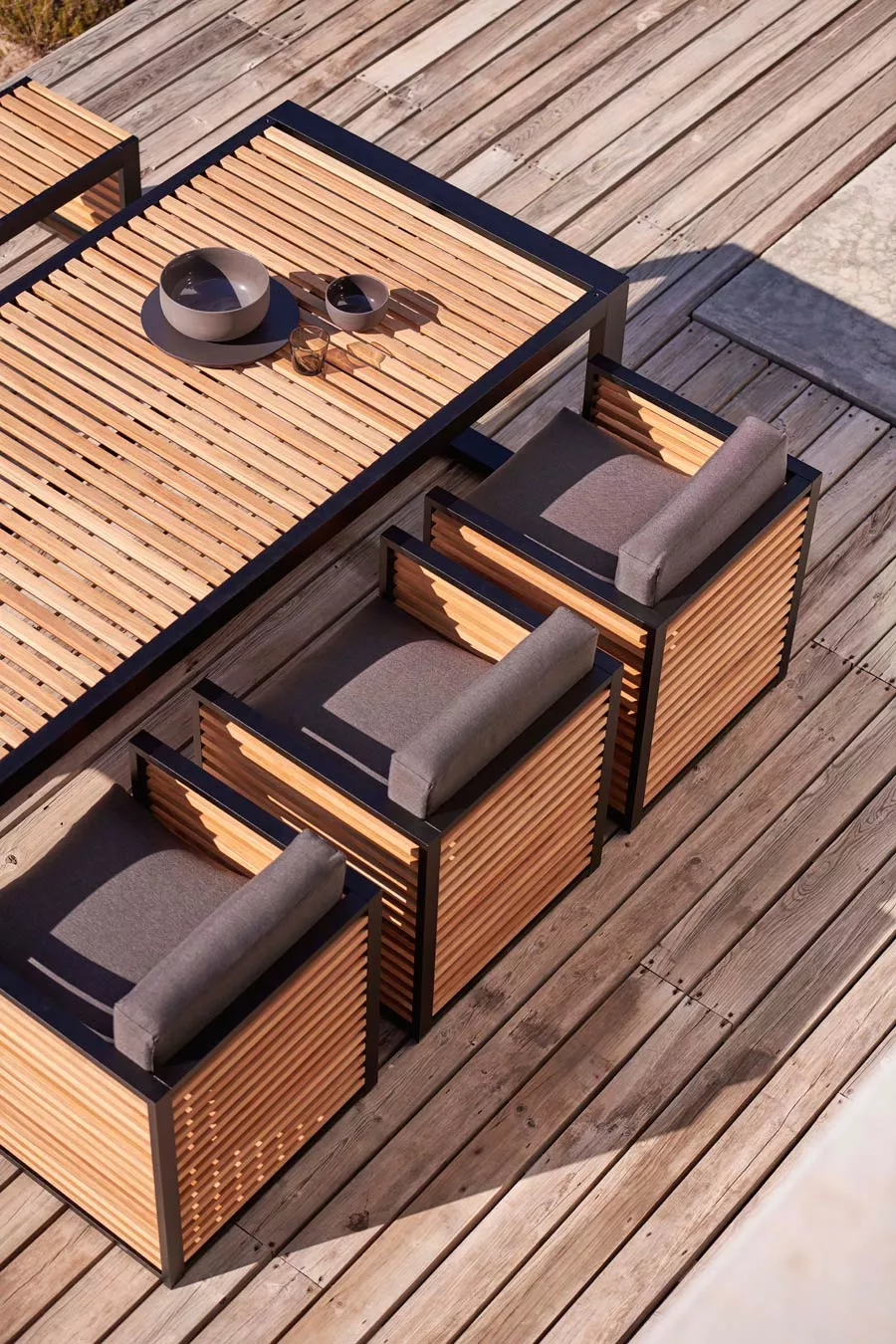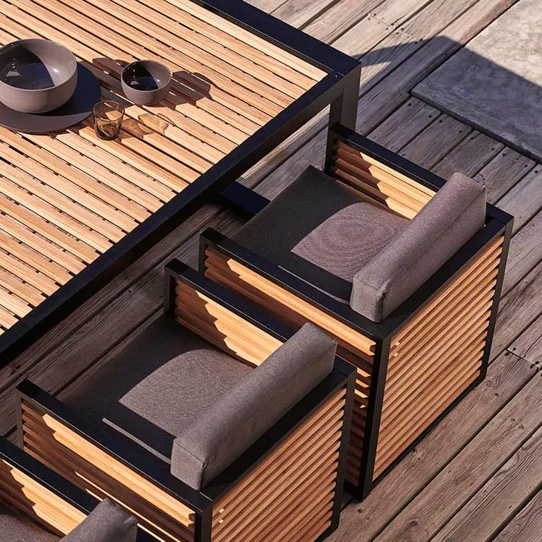 DNA Teakholz ist eine Kollektion von Möbeln für den Außenbereich, die durch das subtile Spiel der Licht- und Schattenmodulationen der mediterranen Fensterläden und das Lob des Schattens der japanischen Ästhetik in der traditionellen und zeitgenössischen Architektur inspiriert wurde – das Positive und das Negative ohne jede überflüssige Verzierung. Eine elegante und essentielle Außenmöbelkollektion, die sich mit der Umgebung verschmelzt,von privaten Gärten bis hin zu Contract-Einrichtungen.
