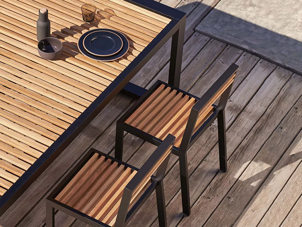 „Ich habe mich stets von dem Lichter- und Schattenspiel der mediterranen Fensterläden angezogen gefühlt. Auch von der Arbeit einiger orientalischen Architekten, die mit Holzleisten und Bambusrohren arbeiten. DNA Teakholz ist eine Kollektion von Möbeln für den Außenbereich, die das Wesen dieser horizontalen Geometrien neu interpretiert.“ José A. Gandia-Blasco