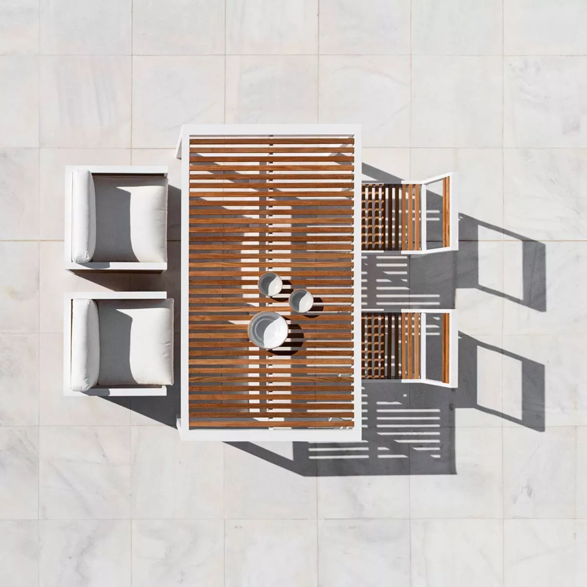 DNA Teakholz ist eine Kollektion von Möbeln für den Außenbereich, die durch das subtile Spiel der Licht- und Schattenmodulationen der mediterranen Fensterläden und das Lob des Schattens der japanischen Ästhetik in der traditionellen und zeitgenössischen Architektur inspiriert wurde – das Positive und das Negative ohne jede überflüssige Verzierung. Eine elegante und essentielle Außenmöbelkollektion, die sich mit der Umgebung verschmelzt,von privaten Gärten bis hin zu Contract-Einrichtungen.
