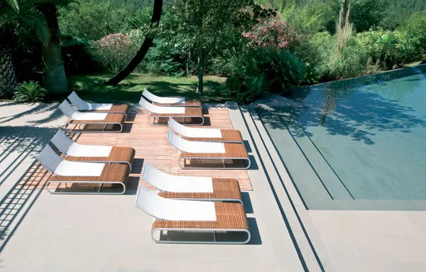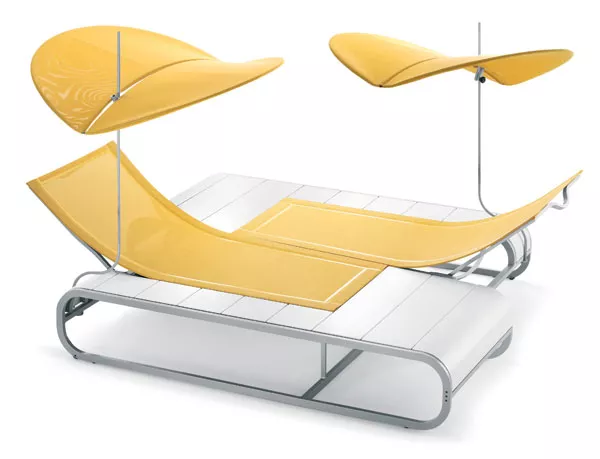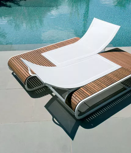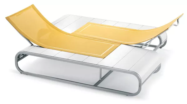 Sonnenliege Tandem mit Batyline® Bespannung, Gestell aus lackiertem Aluminium und einer Tischplatte aus Teakholz oder Corian®.