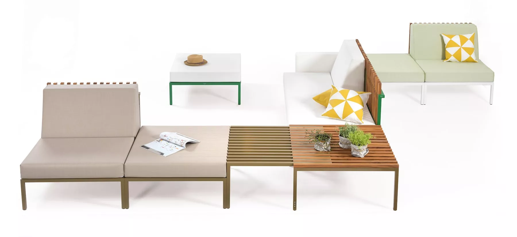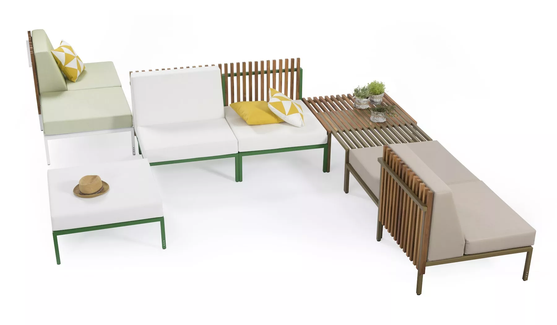 Sutra greift die Kollektion Kama in einem grafischen Design auf, für noch mehr Modularität. In einem Materialmix aus Holz und Aluminium spiel die neue Kollektion Sutra mit dem Schatten und das Licht.