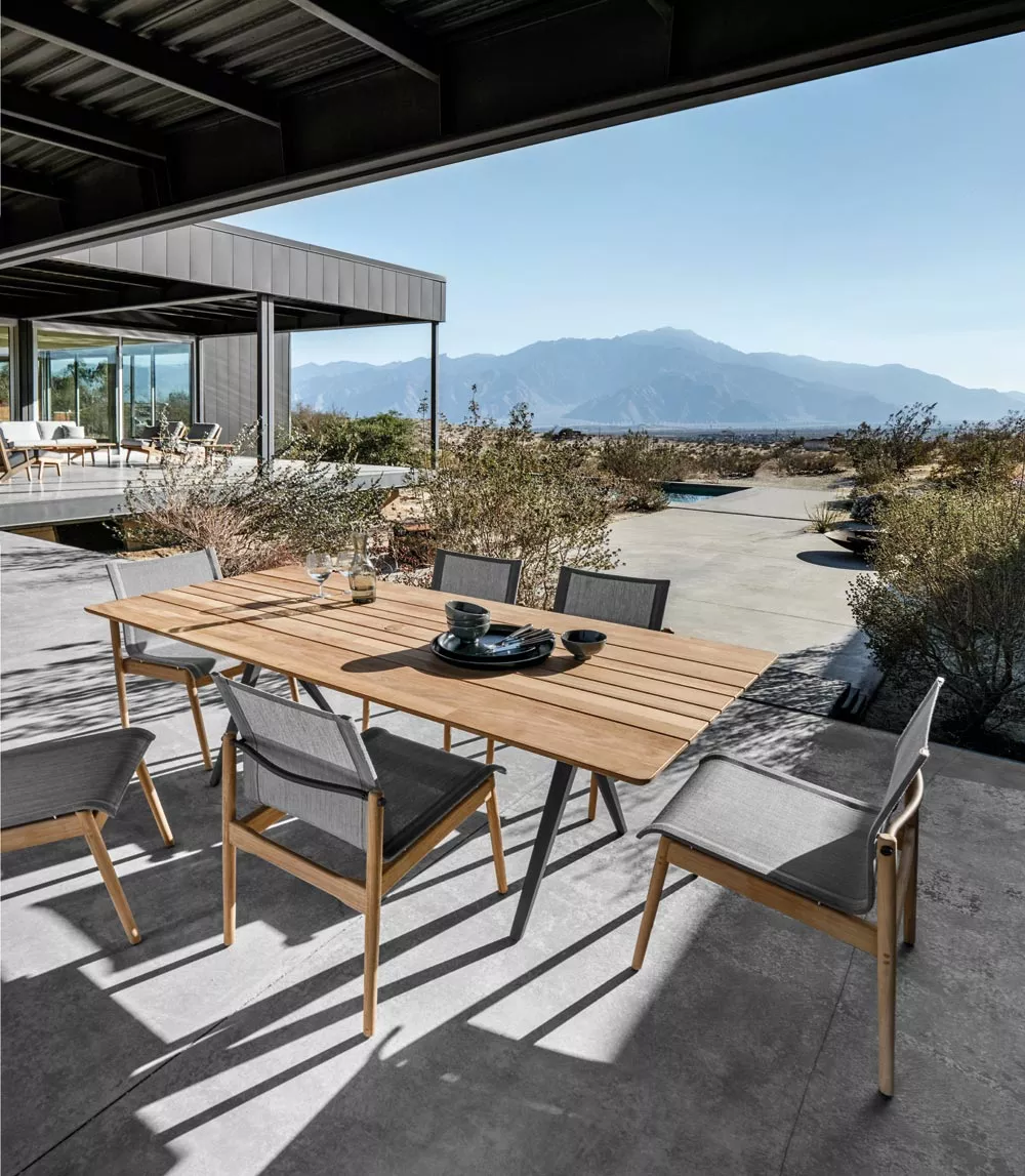 Im Außenbereich verbringen wir oft mehr Zeit mit Entspannung und Muße, und zum Essen lassen wir uns Zeit. Warum sollten wir es uns also nicht so angenehm machen wie möglich – mit einer Freischwinger-Konstruktion und flexibler Sling-Sitzfläche, die enormen Komfort bietet?
