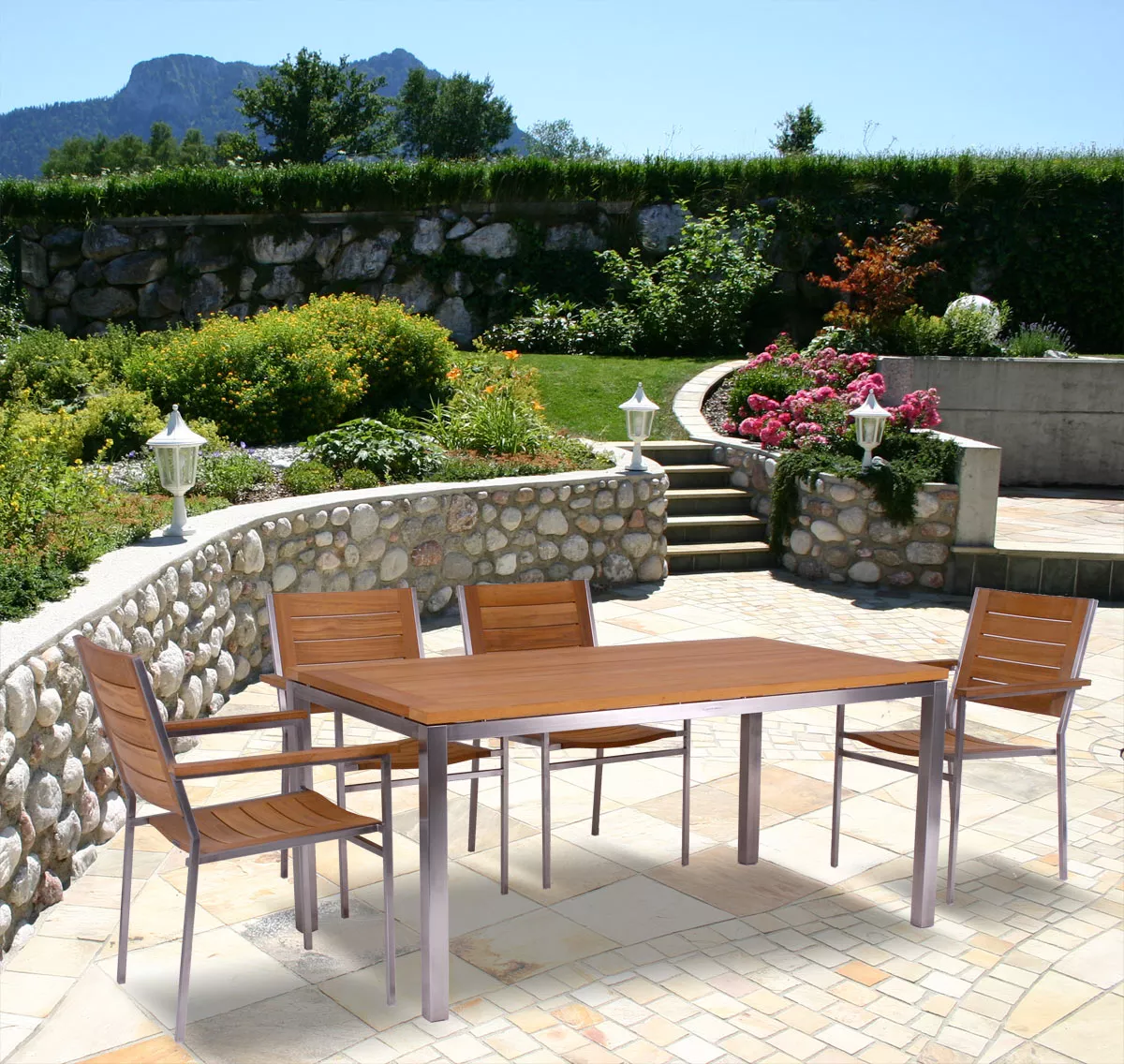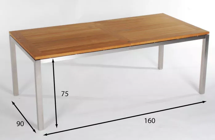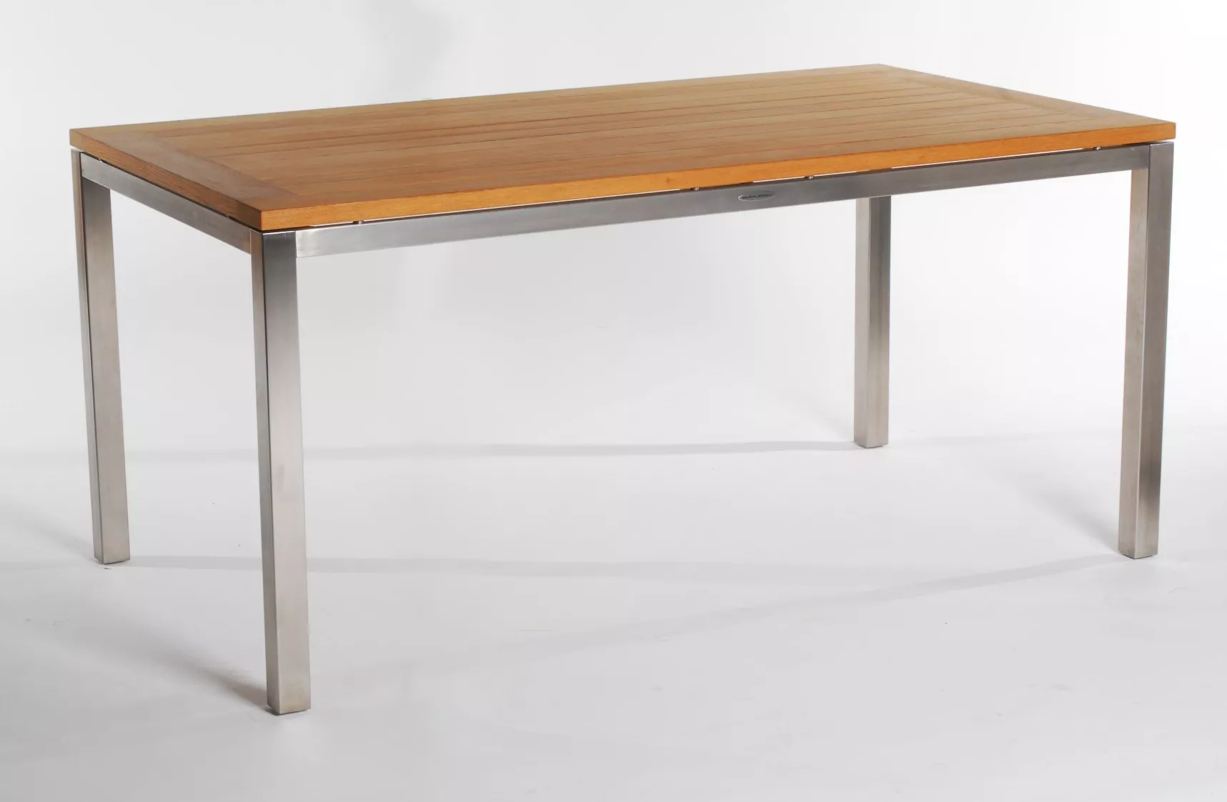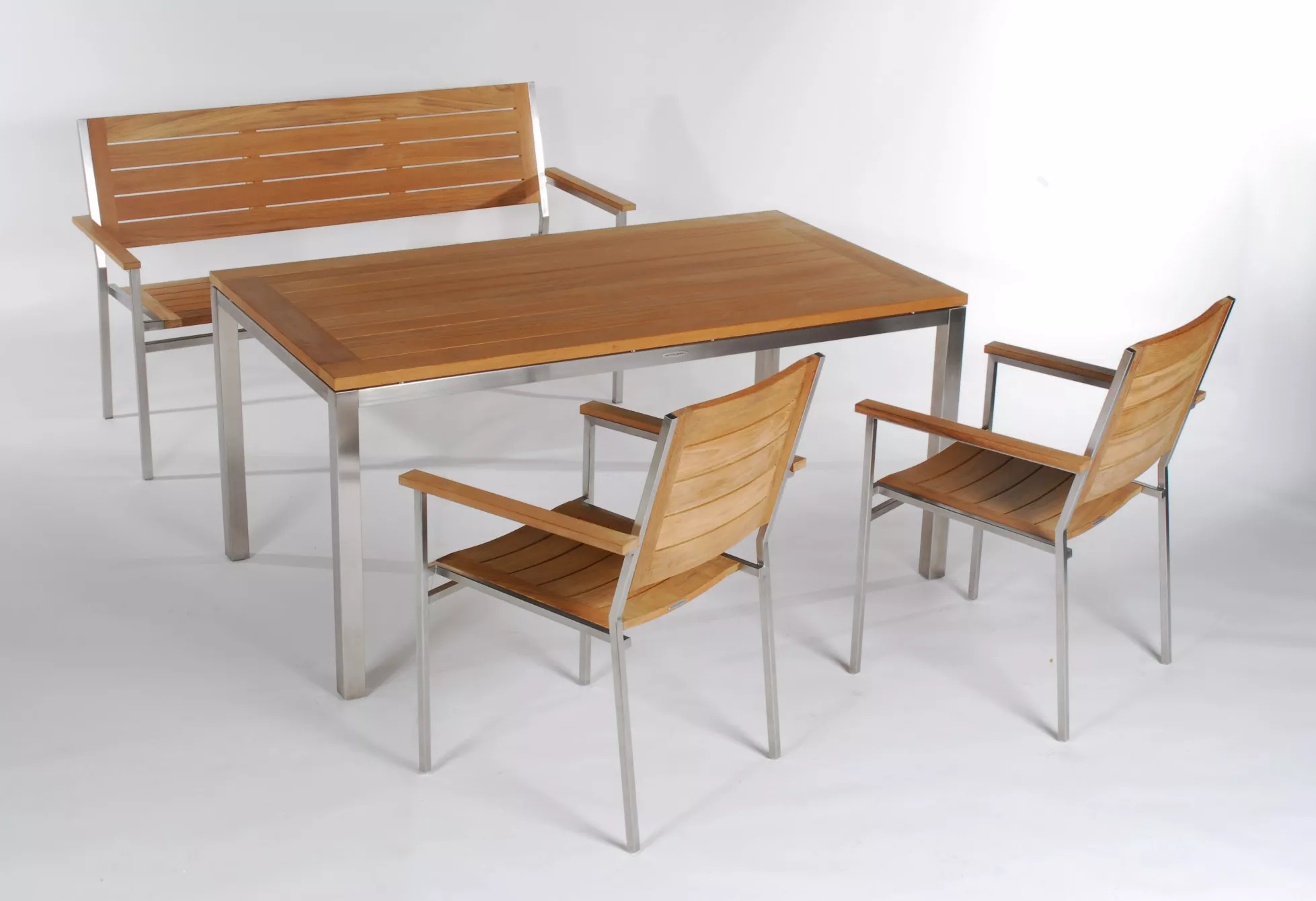 mit einer Tischplatte aus Teakholz und einem Gestell aus Edelstahl