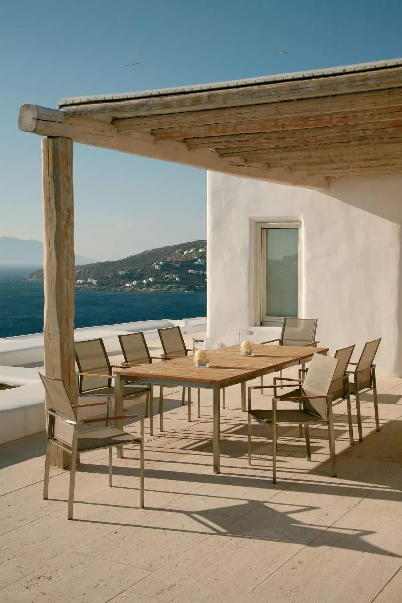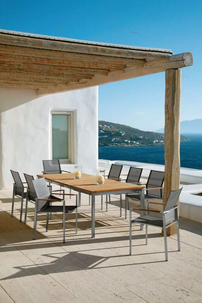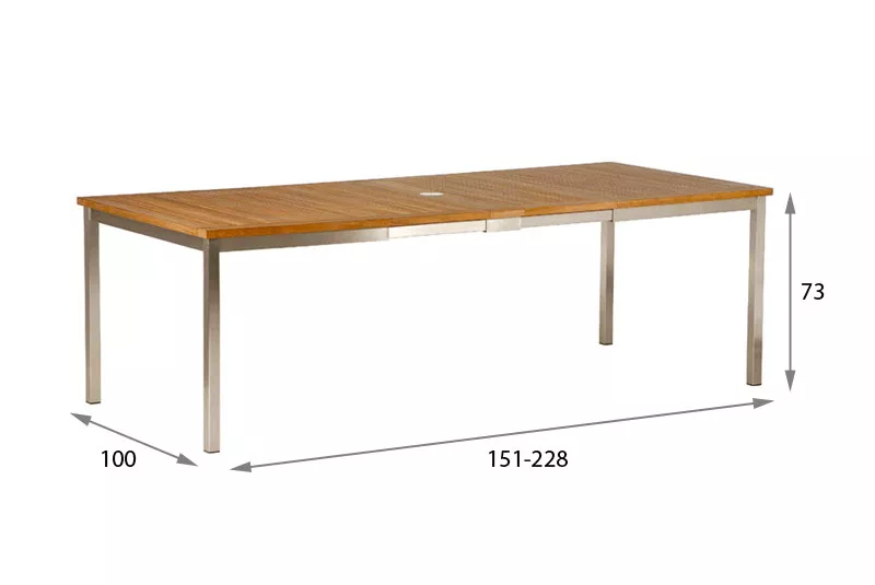 Esstisch Equinox mit einem Sonnenschirmloch, Tischplatte aus Teakholz und Gestell aus Edelstahl.